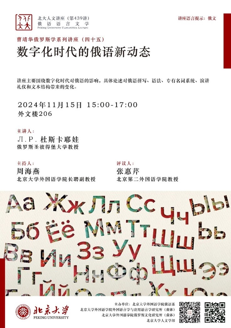 2024年11月15日下午,俄罗斯圣彼得堡国立大学杜斯卡耶娃教授(Л.Р. Дускаева)应邀在B体育平台外文楼206会议室进行讲座,主题为“数字化时代的俄语新动态”。本次讲座系“北京大学人文讲座”第439讲暨“曹靖华俄罗斯学系列讲座”第45讲,由B体育平台俄语系、外国语言学及应用语言学研究所(虚体)、俄罗斯文化研究所(虚体)和北京大学人文学部主办。