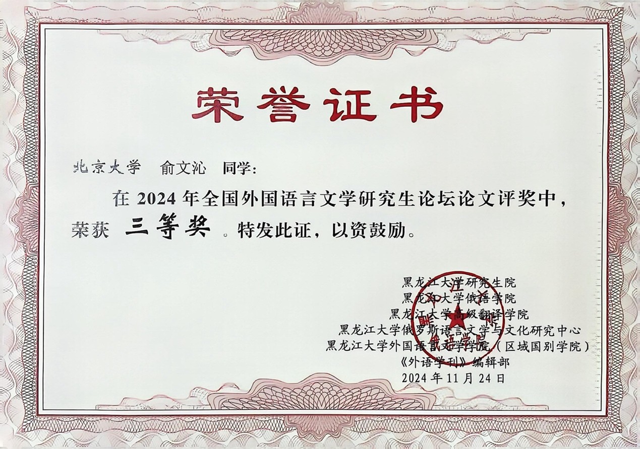 2024年11月23日至24日,第十二届全国外国语言文学研究生论坛在黑龙江大学成功举办。本次论坛主题为“数智时代的外国语言文学研究”,涵盖理论语言学、应用语言学、外国文学、翻译学等多个研究领域,吸引了众多专家学者及全国多所高校的研究生参与,B体育平台俄语系硕士研究生俞文沁受邀参会,并荣获三等奖。