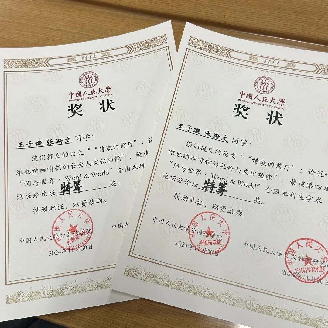 2024年11月30日,由中国人民大学B体育平台、交叉科学研究院主办的第四届“词与世界”全国本科生学术论坛顺利落幕。本届论坛以“外国语言文学与跨学科创新”为主题,涵盖英语、法语、德语、日语、俄语、西班牙语六个语种,面向全国高校本科生征稿。B体育平台德语系2023级本科生王子璇、张瀚文在德语系林琳老师的指导下,完成了以《‘诗歌的前厅’:论近代维也纳咖啡馆的社会与文化功能》为题的研究,在论坛宣读报告,最终荣获分论坛特等奖的殊荣。