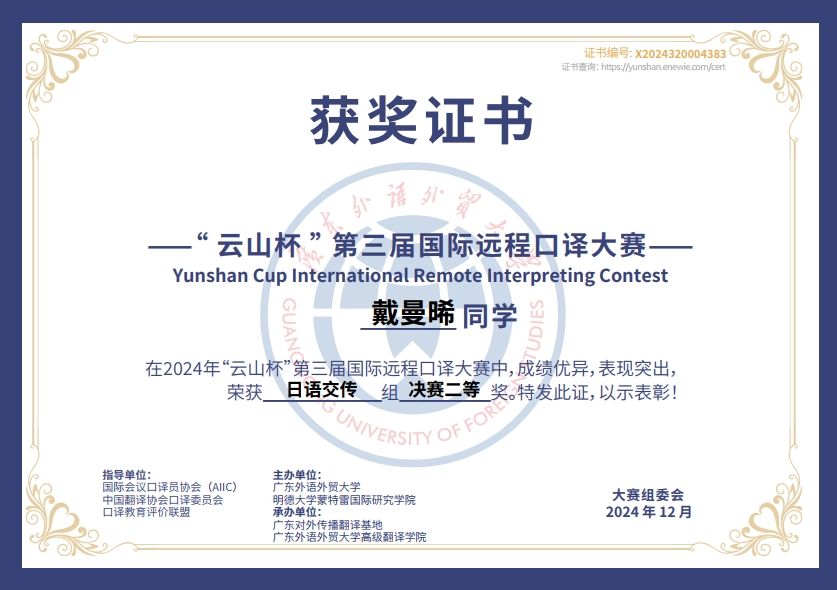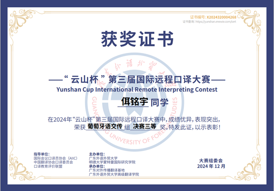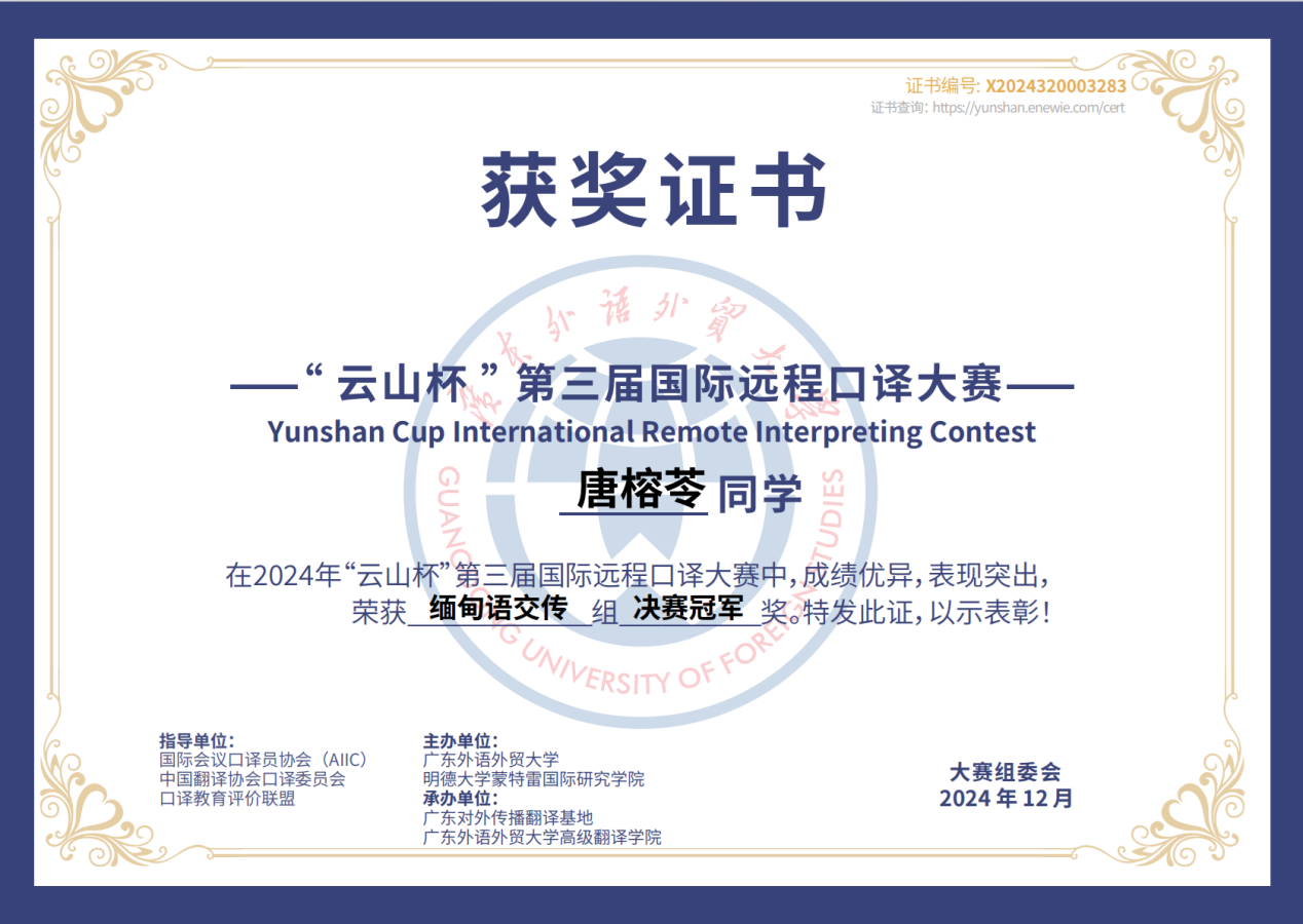 在比赛中,唐榕苓同学凭借准确的语言转换、流畅的表达以及对缅甸文化的深刻理解,赢得了评委们的一致好评。戴曼晞同学在两场决赛中无缝切换,展露出深厚的语言功底,同时拿下两项大奖。佴铭宇作为一名本科生,能够与专业译者及研究生同台竞技并脱颖而出,也充分展现了他扎实的语言功底和出色的口译能力,以及在远程口译环境中的应变能力和高效沟通技巧。