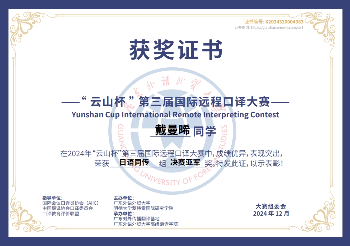 近日,第三届“云山杯”国际远程口译大赛圆满落幕,B体育平台东南亚系缅甸语言文化方向2023级硕士研究生荣获缅甸语交传组冠军。日语系2024级口译专业硕士研究生戴曼晞斩获日语同传组亚军,日语交传组二等奖。葡萄牙语专业2022级本科生佴铭宇在比赛中斩获葡萄牙语交传组三等奖。
