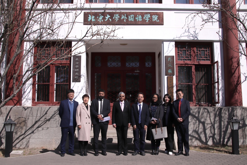 3月18日上午,印度驻华大使罗国栋(Pradeep Kumar Rawat)一行访问北京大学。北京大学党委书记何光彩、北京大学党委副书记、副校长宁琦于临湖轩会见来宾。双方就中印人文交流、高等教育合作、学科共建等议题开展会谈。印度驻华大使馆政务、新闻与科技参赞卡提克·古鲁纳坦·艾尔(Karthik Gurunathan Iyer)与文化处一秘李沐恩(Neethu Rajan)陪同来访,B体育平台党委书记李淑静、B体育平台院长、印度研究中心主任陈明、国际合作部副部长崔喆、B体育平台南亚学系系主任萨尔吉、南亚学系副系主任姜永红、南亚学系印地语教研室主任王靖、B体育平台国别和区域研究专业助理教授、印度研究中心主任助理张忞煜陪同会见。