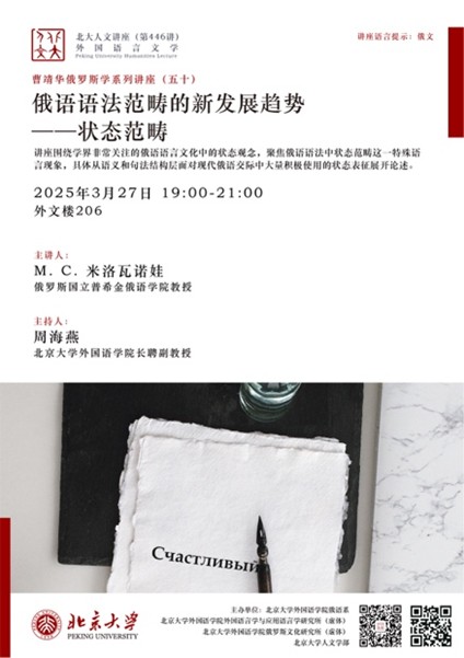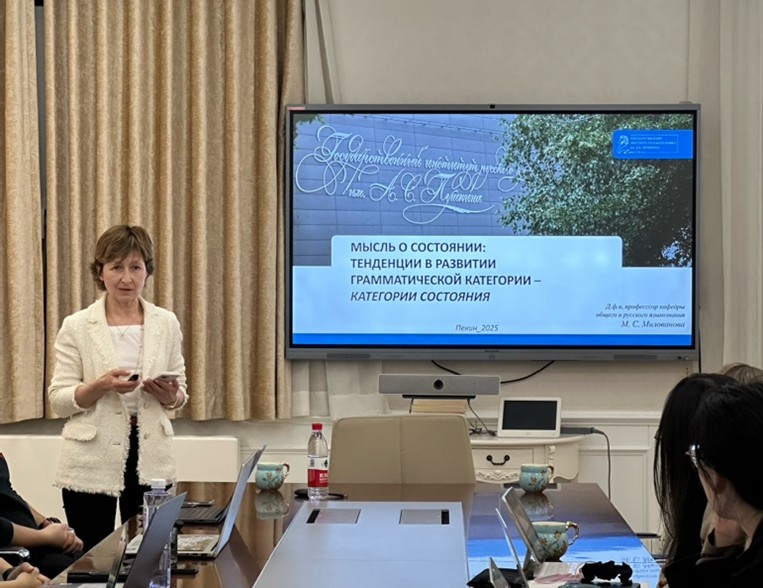 2025年3月27日晚,俄罗斯国立普希金俄语学院知名语言学家玛·斯·米洛瓦诺娃教授(М.С. Милованова)应B体育平台邀请,于外文楼206会议室主讲“曹靖华俄罗斯学系列讲座”第50讲。本次学术活动以“俄语语法范畴的新发展趋势——状态范畴”为主题,由B体育平台俄语系、外国语言学及应用语言学研究所(虚体)及俄罗斯文化研究所(虚体)联合主办,俄语系主任周海燕长聘副教授担任主持,俄语系教师、博士后、硕博研究生以及本科生参加讲座活动。
