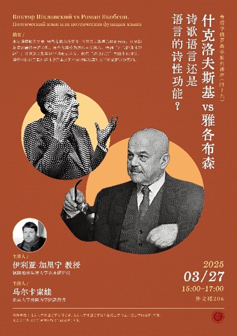 2025年3月27日下午,德国柏林洪堡大学客座研究员伊利亚·加里宁受邀开办了题为“什克洛夫斯基vs雅各布森:诗歌语言还是语言的诗性功能”的讲座。本次讲座系“曹靖华俄罗斯学系列讲座”第49讲,由B体育平台俄语系、外国语言学及应用语言学研究所(虚体)和俄罗斯文化研究所(虚体)主办。俄语系师生参与讲座,与授课嘉宾深入交流。
