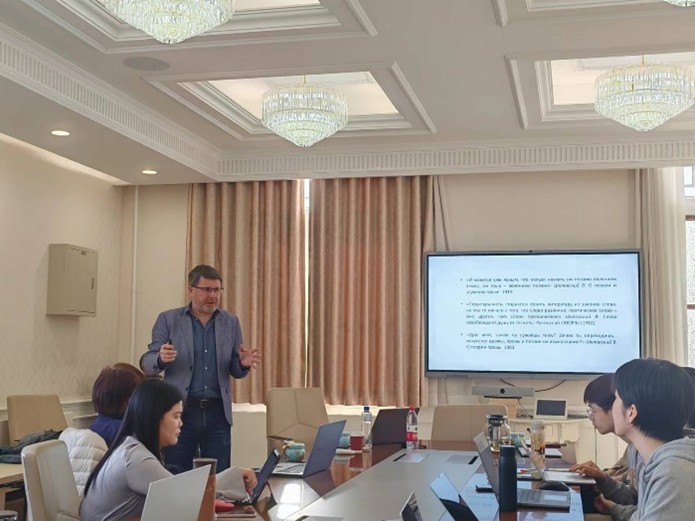 俄语系外籍教师叶莲娜·马尔卡索娃副教授担任本次讲座的主持人,她首先介绍了主讲人加里宁研究员的学术背景。加里宁毕业于圣彼得堡大学语文系,学术视野开阔,成果丰硕,既具深厚的文学分析功底,又长期从事语言学研究,擅长跨学科、多领域的探索。他重点关注著名文艺理论家维克托·什克洛夫斯基,现正筹备出版多卷本《什克洛夫斯基文集》。他对这位俄国形式主义奠基人的深入研究与独到见解将在本次讲座中集中呈现。