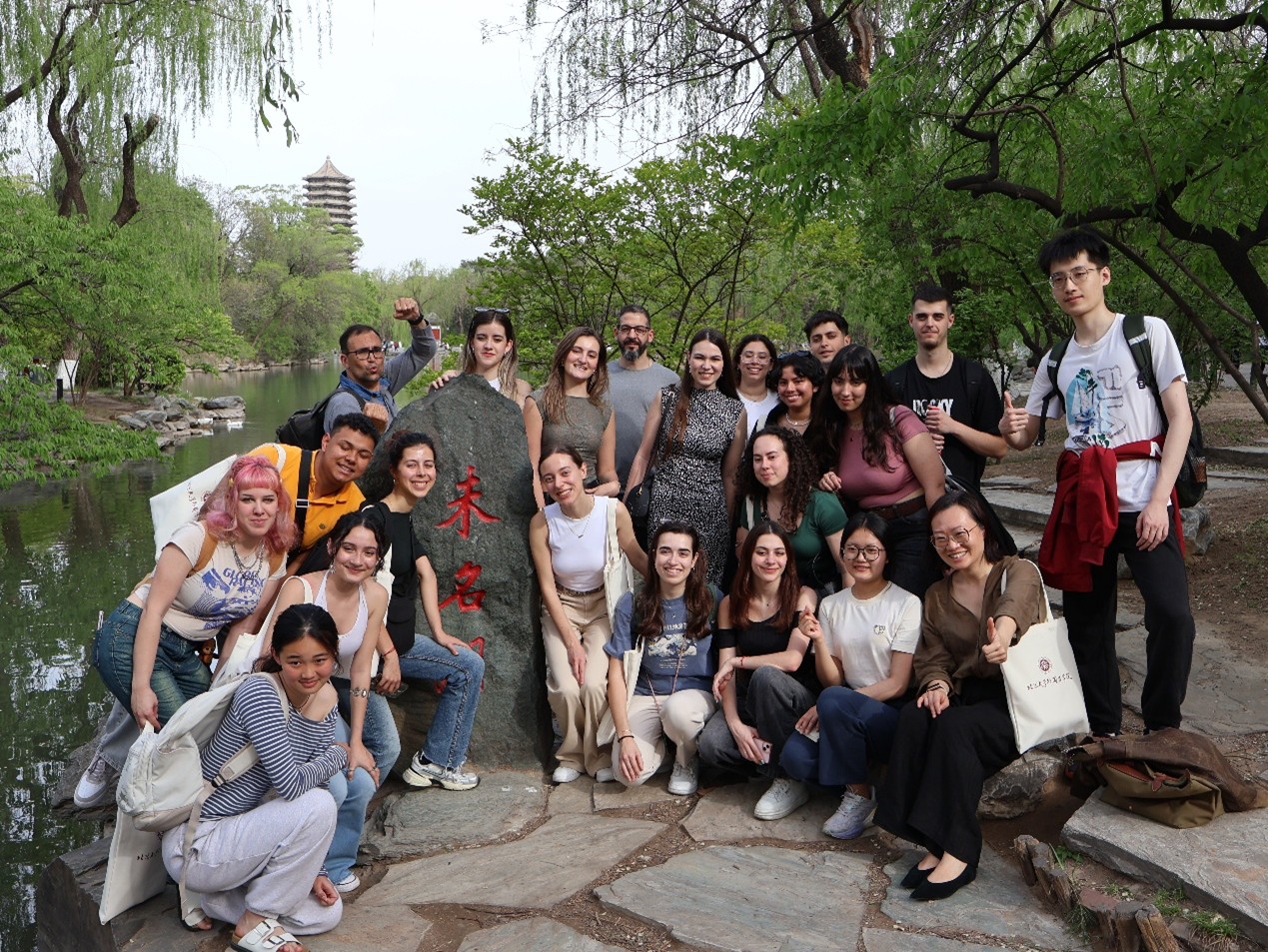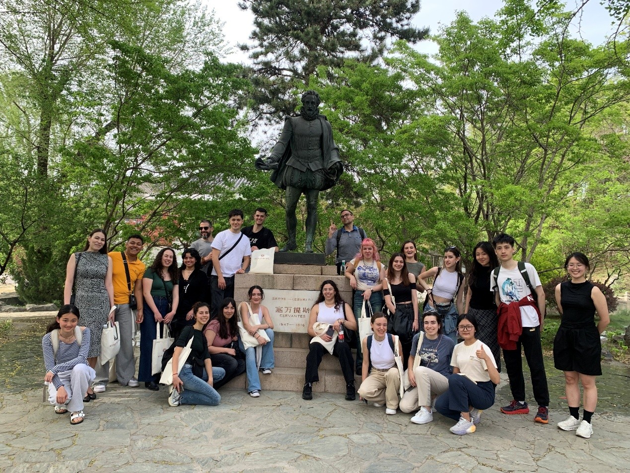 此后,北大西语系同学引领和陪同格大孔院同学参观了北大图书馆、燕南园、未名湖、博雅塔等校园地标。同学们特别介绍了校史馆前的塞万提斯像,这座由马德里市政府赠送的铜制塑像见证了中西两国的文化友谊,并在今日获得延续与发展。2022级本科生闫荣荣、刘思嘉同学负责介绍有关历史。中、西同学在未名湖前合影留念,圆满结束此次交流活动。