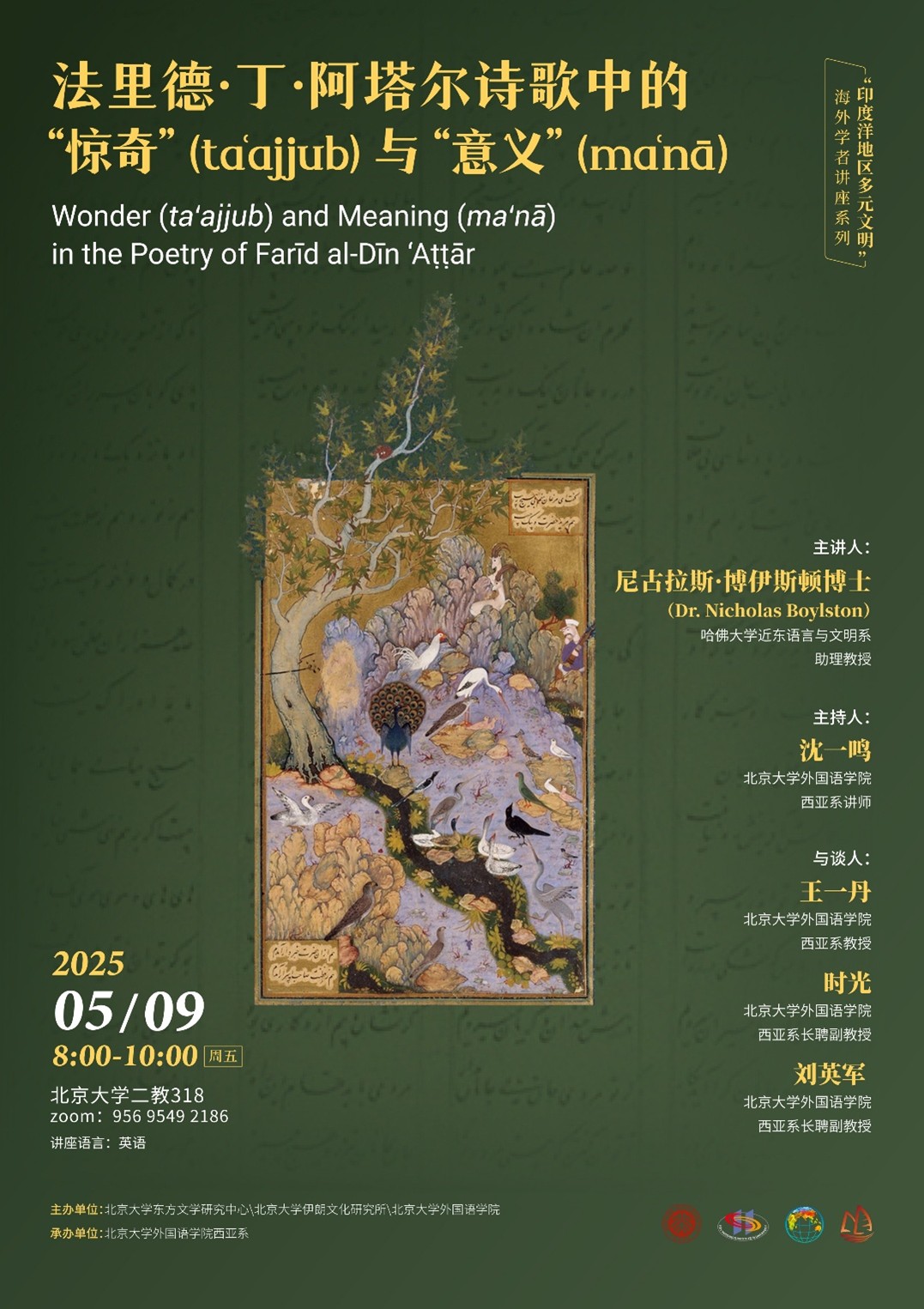 2025年5月9日上午,哈佛大学近东语言与文明系助理教授尼古拉斯·博伊斯顿博士(Dr. Nicholas Boylston)在线上为北京大学师生做了主题为“法里德·丁·阿塔尔诗歌中的‘惊奇’(ta‘ajjub)与‘意义’(ma‘nā)”的讲座。本次讲座是“印度洋地区多元文明”海外学者讲座系列之一,由北京大学东方文学研究中心、北京大学伊朗文化研究所和B体育平台主办,B体育平台西亚系承办。讲座由B体育平台西亚系讲师沈一鸣主持,西亚系教授王一丹、长聘副教授时光、长聘副教授刘英军与谈。到场的还有波斯语专业本科生,以及来自北京大学中文系、历史学系和经济学院等院系的师生。