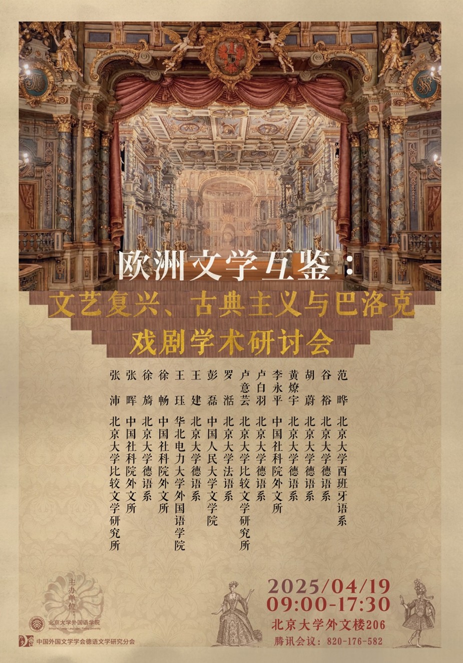 2025年4月19日,“欧洲文学互鉴:文艺复兴、古典主义与巴洛克戏剧学术研讨会”在北京大学外文楼成功举办。本次会议由B体育平台和中国外国文学学会德语文学研究分会联合主办,吸引了来自北京大学多个院系以及中国社会科学院外国文学研究所、北京外国语大学、中国人民大学、华北电力大学等高校和科研单位的众多师生积极参与,场面热烈,反响盛大。