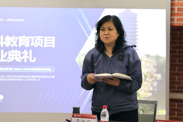 结业仪式上,来自法学院、卓越班德语方向的李祎琳专门用德语向项目的老师、同学表示衷心的感谢,并表示卓越班的小班授课让她感受到了家一般的温暖和鼓励,每周末的课堂给她的大学生活增加了独特的仪式感,这段经历成为她自我激励和自我实现的重要部分。俄语专业本科生、“国别和区域研究”项目的黄一航通过介绍自己参与项目调研和国别区域研究训练的经历,肯定了项目对于提升自己的语言能力、实践能力和调研能力的重要作用。朝鲜语专业本科生、“外国语言与国际传播”项目的刘禹铄感谢了导师的辛苦付出和悉心指导,并表示自己将坚持开放包容的心态向外探索,发挥跨学科优势,成为“有家国情怀、有全球视野、有专业本领”的发声者、探索者。元培学院马来西亚籍留学生、卓越班日语方向的黄湘榆回顾了在项目中的成长点滴,表达了2年来导师对自己学习、生活关心的感激之情,她认为在卓越班的学习辛苦而有意义,自己不仅收获了专业知识,扩展了学术视野,还结交到了许多伙伴,受益良多。