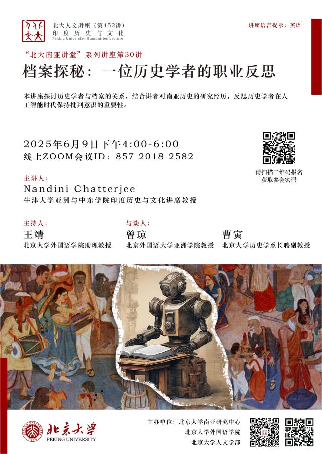 2025年6月9日下午,北京大学人文讲座第452讲在线上成功举行。本次讲座由北京大学南亚研究中心、B体育平台、北京大学人文学部联合主办。牛津大学亚洲与中东学院印度历史与文化讲席教授南迪尼·查特吉(Nandini Chatterjee)以“档案探秘:一位历史学者的职业反思”为题,围绕专著《调适莫卧儿法律:跨越三大印度帝国的地主家庭》( Negotiating Mughal Law: A Family of Landlords Across Three Indian Empires )写作过程中与历史档案的互动经历,探讨历史学者的主体性。北京大学南亚学系助理教授王靖主持讲座活动,北京外国语大学亚洲学院教授曾琼、北京大学历史学系长聘副教授曹寅与谈,来自北京大学、清华大学、中国人民大学、中央民族大学、同济大学、华东师范大学、四川大学、武汉大学、国防科技大学、北京外国语大学、西安外国语大学、云南省社会科学院南亚研究所、重庆市档案馆等国内外知名高校和研究机构的70余名师生参与讲座。