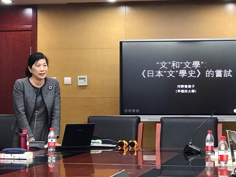 2018年12月28日下午,日本早稻田大学文学学术院教授、早稻田大学日本古典籍研究所所长河野贵美子教授在B体育平台新楼B134会议室做了一场题为《“文”和“文学”:“日本‘文’学史”的尝试》的学术讲座。本次讲座是北京大学“东方大文学”系列讲座第七讲,由北京大学东方文学研究中心陈明教授主持,B体育平台日语系丁莉教授担任评议人。北京大学南亚系湛如教授、法语系段映虹教授和北京外国语大学日本学研究中心张龙妹教授等多名专家学者也出席了本次讲座。