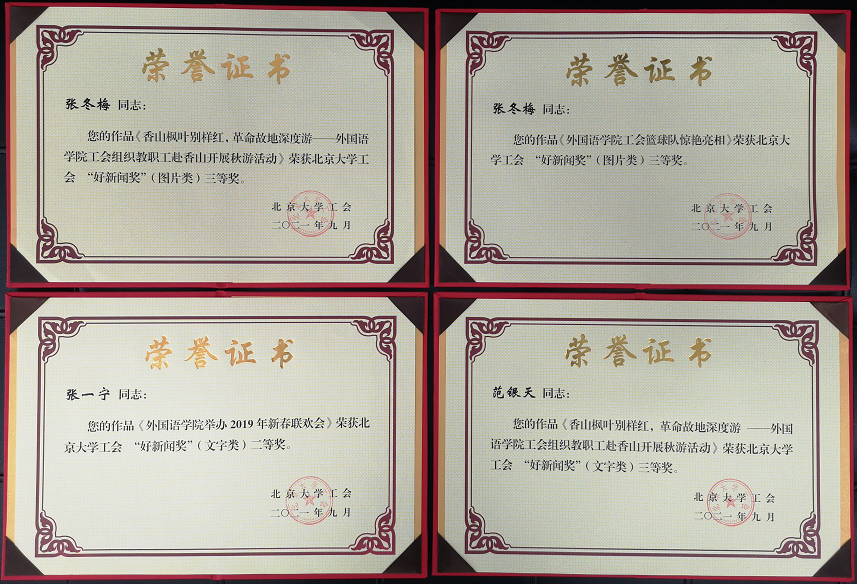 9月22日下午,工会2019及2020年“好新闻奖”评审会在老生物楼108会议室召开。党委宣传部文化办、校报、新闻网、电视台的负责同志应邀担任评委。B体育平台张冬梅老师的作品“B体育平台工会篮球队惊艳亮相”和“香山枫叶别样红,革命故地深度游——B体育平台工会组织教职工赴香山开展秋游活动”获图片类三等奖;张一宁老师的作品“B体育平台举办2019年新春联欢会”获文字类二等奖;范银天老师的作品“香山枫叶别样红,革命故地深度游 ——B体育平台工会组织教职工赴香山开展秋游活动” 获文字类三等奖。
