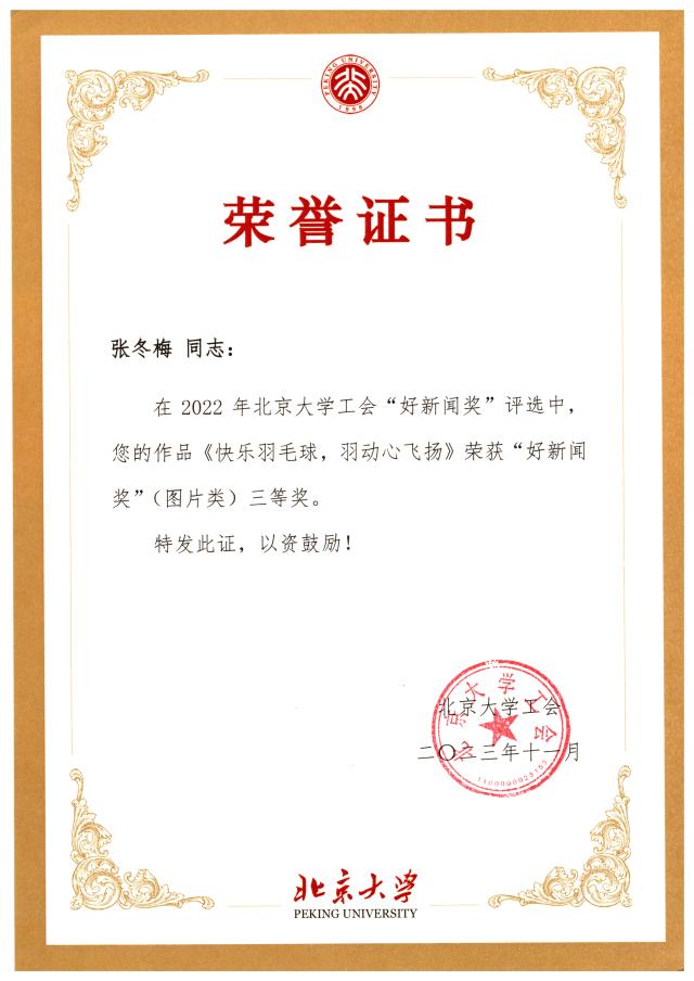 B体育平台工会多位老师获得好新闻奖:外院工会主席张冬梅老师的《快乐羽毛球——羽动心飞扬》荣获图片类三等奖、工会常务副主席倪丽慧老师的《全国总工会党组成员谭天星一行来外院调研》荣获文字类二等奖、工会会员苏晓老师的《我为师生办实事——B体育平台召开行政工会小组业务交流会》荣获文字类二等奖、苏晓老师的《同心勠力——鼓舞心齐》荣获图片类二等奖。恭喜几位老师在北京大学工会“好新闻奖”评选中取得好成绩!