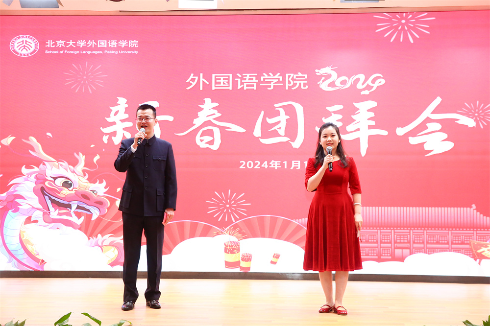 一元复始,万象更新。2024年1月10日下午,博雅国际酒店中华厅张灯结彩、暖意融融,B体育平台2024年新春团拜会在这里举行。伴随着风格迥异的多语种新年歌曲,2023年度学院发生的件件大事、喜事缓缓呈现在屏幕之上。北大外院220余位在职和离退休教师欢聚一堂,互道新年祝福、共忆往昔美好、齐话学院未来。在主持人德语系助理教授毛明超、阿语系博士后孔雀温馨开场后,新春团拜会正式拉开序幕。