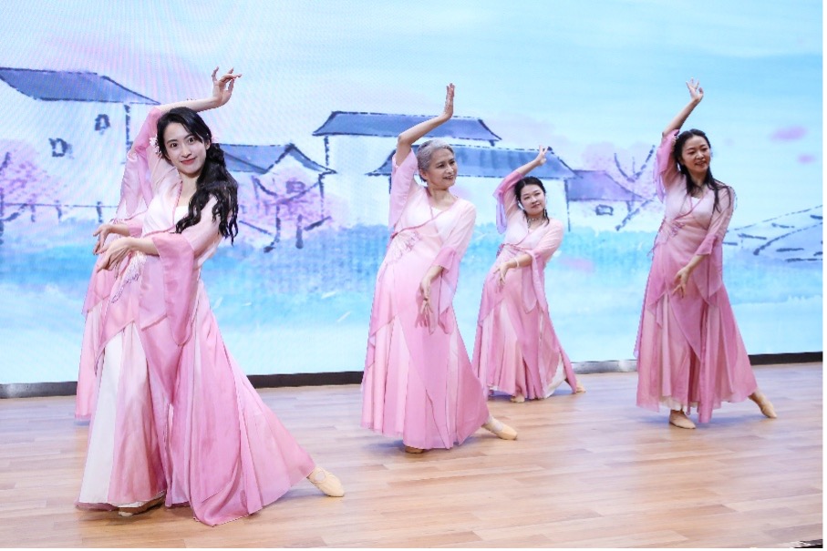 随着悠扬婉转的音乐响起,由高一虹、刘红中、张嘉妹、张琳娜、冯一帆几位老师带来的中国舞《流水桃花》惊艳开场。舞者们衣袂飘飘,翩若惊鸿,她们用灵动的舞姿演绎出桃花映水的唯美意境,将观众带入如梦如幻的艺术世界,为联欢会拉开了绚丽序幕。
