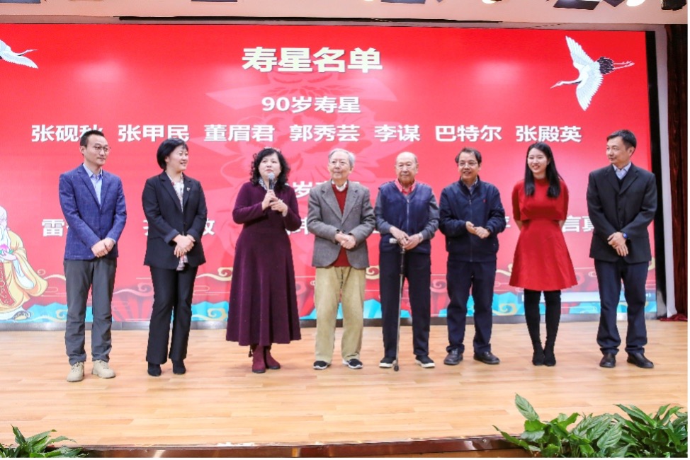 2025年,外院共有7位90岁寿星和6位80岁寿星,遵循团拜会多年传统,党委书记李淑静带领学院领导班子向这些可亲可敬的老寿星们恭祝寿诞。外院取得的每一项成绩、每一步跨越,都离不开广大离退休教师曾经的倾囊相授与始终如一的支持。李淑静带头领唱生日快乐歌,祝愿寿星教师们福寿两全、幸福安康。在温馨舒缓的旋律环绕下,学院领导班子成员为寿星们轻轻系上红围巾,并送上寿诞贺礼,献上深深敬意与暖心祝福。