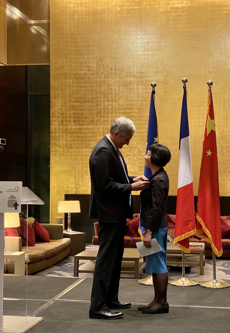 2022年3月17日晚,法兰西共和国“学术棕榈”(les Palmes académiques)骑士勋章的授予仪式在法国驻华大使官邸举行。法国驻华大使罗梁(Laurent Bili)阁下代表法国政府,为B体育平台学术委员会委员、法语系段映虹教授颁发了法兰西共和国“学术棕榈”骑士勋章。当晚正值“2022年国际法语日” (Journée internationale de la Francophonie 2022)庆祝活动,来自外交、教育、体育、艺术与文化各领域的中外嘉宾齐聚一堂。法语国家大使组织主席、瑞士驻华大使罗志谊(Bernardino Regazzoni)阁下,欧盟驻华代表团团长、著名汉学家郁白(Nicolas Chapuis)阁下及各法语国家驻华使节,段映虹老师的亲朋好友出席了授勋仪式。