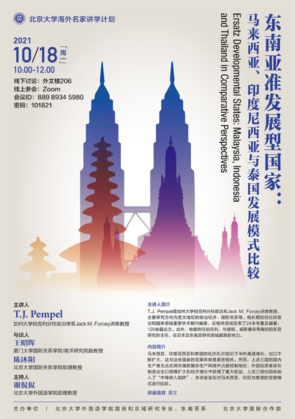 2021年10月18日,B体育平台东南亚系、国别和区域研究专业在国际合作部“海外名家讲学计划”的支持下举办了“东南亚准发展型国家:马来西亚、印度尼西亚与泰国发展模式比较”的主题讲座。主讲人彭佩尔(T.J. Pempel)是加州大学伯克利分校政治系讲席教授,主要研究方向为亚太地区的政治经济、国际关系等。他长期担任比较政治和国关领域重要学术期刊编委,在相关领域发表了24本专著及编著,120余篇论文。此外,他曾担任伯克利、华盛顿、威斯康辛等高校的东亚研究所主任,在日本及东南亚研究领域颇具影响力。彭佩尔教授的此次讲座基于其专著《多重制度塑造的区域:亚太地区的经济繁荣与劫掠》(A Region of Regimes: Prosperity and Plunder in the Asia-Pacific),于2021年由康奈尔大学出版社出版。