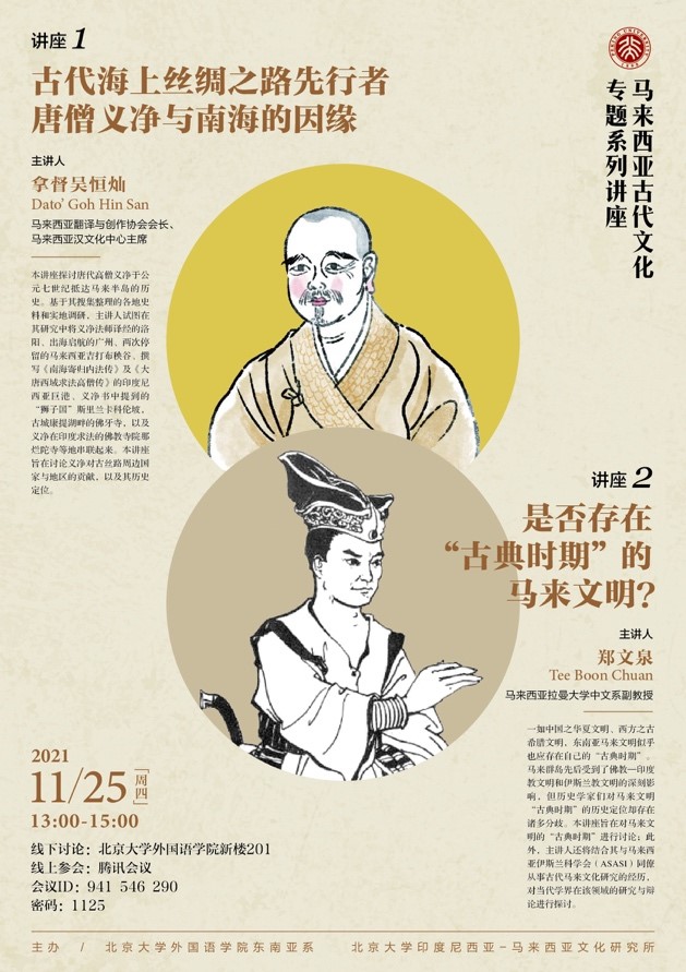 2021年11月25日,B体育平台东南亚系、印度尼西亚—马来西亚文化研究所举办了马来西亚古代文化专题系列讲座“古代海上丝绸之路先行者唐僧义净与南海的因缘”和“是否存在‘古典时期’的马来文明?”。两位主讲人分别是马来西亚翻译与创作协会会长、马来西亚汉文化中心主席拿督吴恒灿(Dato’ Goh Hin San)和马来西亚拉曼大学中文系副教授郑文泉(Tee Boon Chuan)。讲座以线上线下结合的方式进行,由B体育平台东南亚系谢侃侃助理教授主持,东南亚系罗杰副教授作为与谈人参与了讨论。
