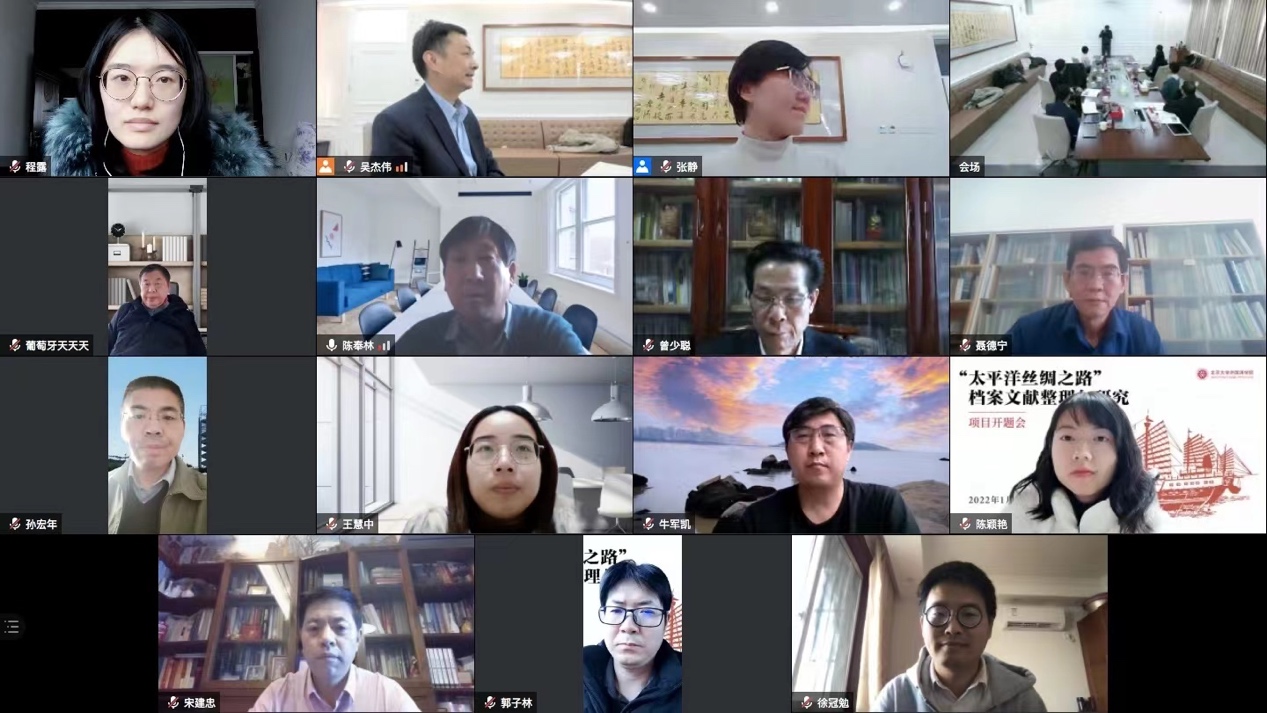 2022年1月15日,由B体育平台吴杰伟教授主持的国家社会科学基金中国历史研究院重大历史问题研究专项2021年度重大招标项目“‘太平洋丝绸之路’档案文献整理与研究”开题会在北京大学举行。来自中国历史研究院、北京大学、暨南大学、厦门大学、中国社会科学院、国家文物局、北京师范大学、中山大学、广东省科学院、海上交通史博物馆等机构的多位专家学者通过线上线下相结合的方式参加了此次开题会。