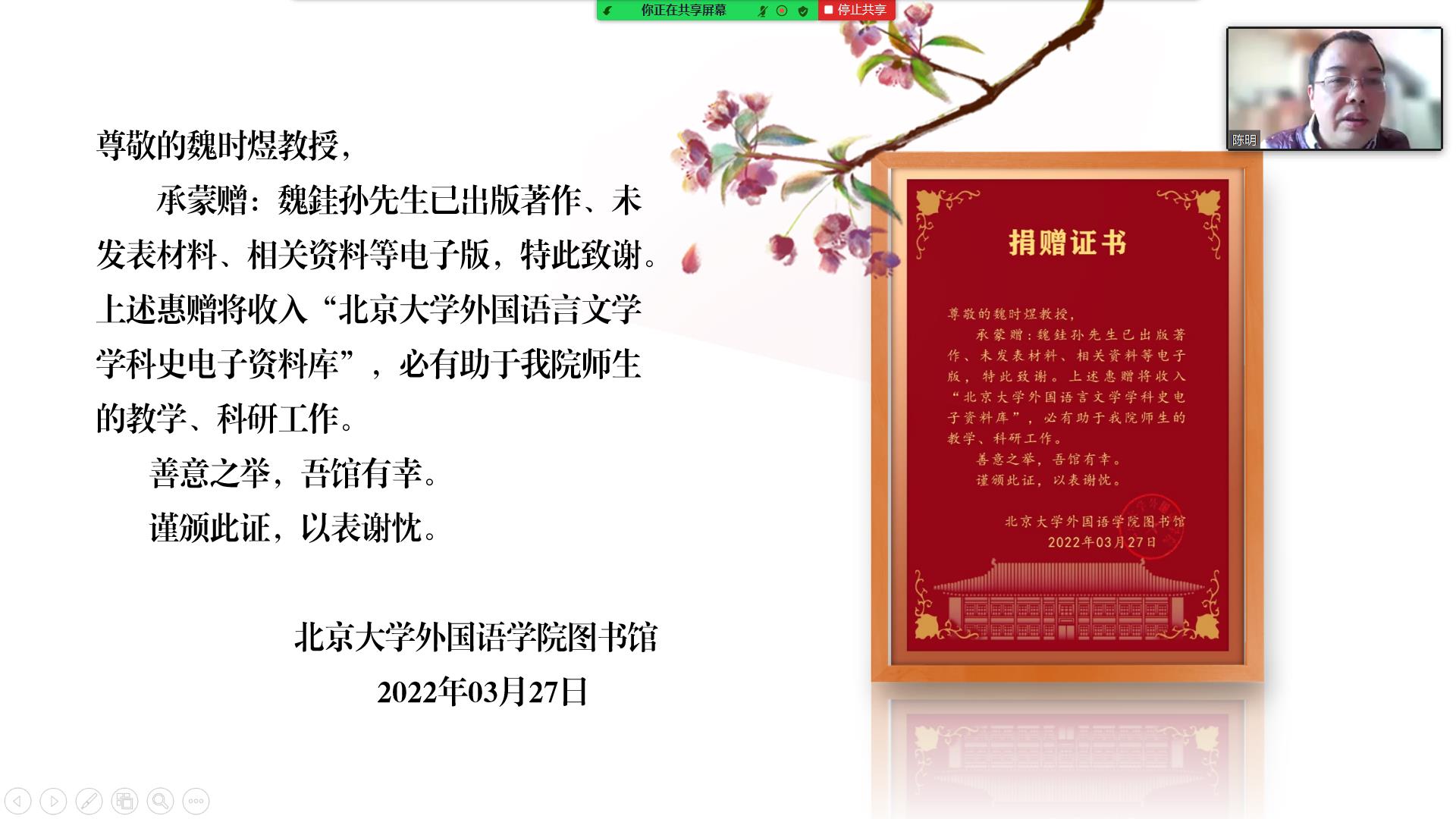 随后,B体育平台院长陈明教授线上为香港城市大学魏时煜教授颁发捐赠证书。陈明教授对魏时煜教授慷慨捐赠魏銈孙先生已出版著作、未发表材料、相关资料等的电子版材料表示感谢。这些资料将收入“北京大学外国语言文学学科史电子资料库”,有助于推动师生的教学和科研工作。