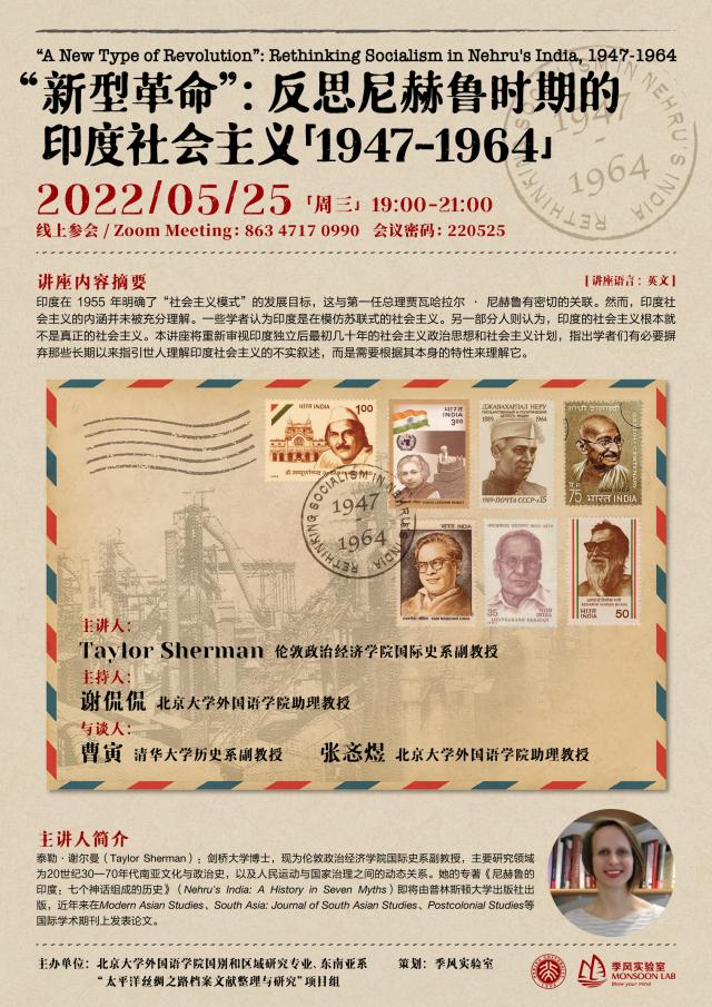 2022年5月25日晚,伦敦政治经济学院国际史系副教授泰勒· 谢尔曼(Taylor Sherman)应邀为我院师生进行了一场题为“‘新型革命’:反思尼赫鲁时期的印度社会主义,1947-1964”的线上讲座。本次讲座由B体育平台国别和区域研究专业、东南亚系和“太平洋丝绸之路档案文献整理与研究”项目组主办,B体育平台谢侃侃助理教授主持,清华大学历史系曹寅副教授和北大外院国别和区域研究专业张忞煜助理教授参与讨论。