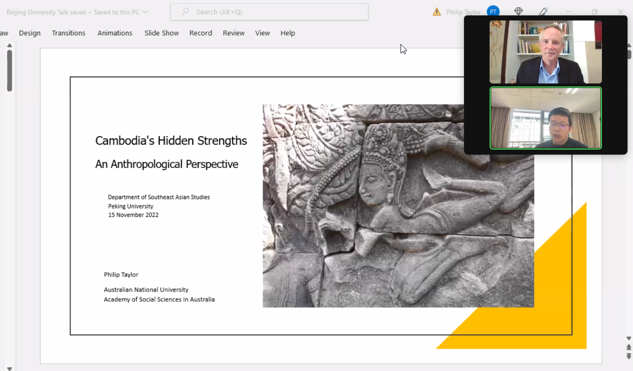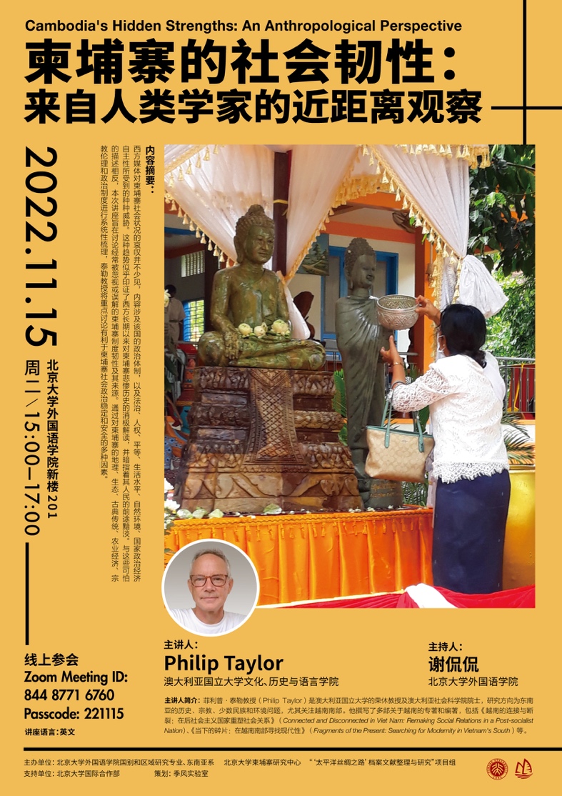 2022年11月15日,澳大利亚国立大学菲利普·泰勒(Philip Taylor)教授应B体育平台邀请进行了一场线上讲座,题为“柬埔寨的社会韧性:来自人类学家的近距离观察”。此次讲座由北京大学柬埔寨研究中心、北大外院国别和区域研究专业、东南亚系及“‘太平洋丝绸之路’档案文献整理与研究”项目组联合主办,并得到北京大学国际合作部的支持。