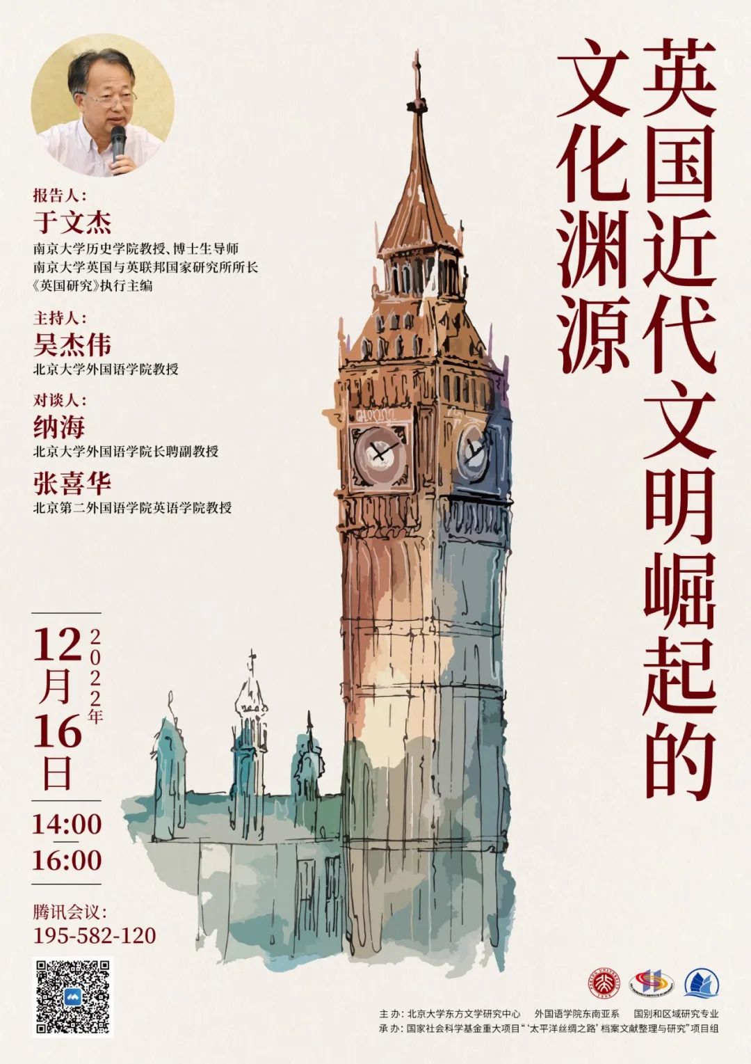 2022年12月16日下午,南京大学历史学院于文杰教授应邀为我院师生开展了一场题为“英国近代文明崛起的文化渊源”的线上讲座。本次讲座由北京大学东方文学研究中心、B体育平台东南亚系、国别和区域研究专业主办,国家社会科学基金重大项目“太平洋丝绸之路档案文献整理与研究”项目组承办。讲座由吴杰伟教授主持,B体育平台英语系纳海长聘副教授和北京第二B体育平台英语学院张喜华教授作为与谈人参与讨论。