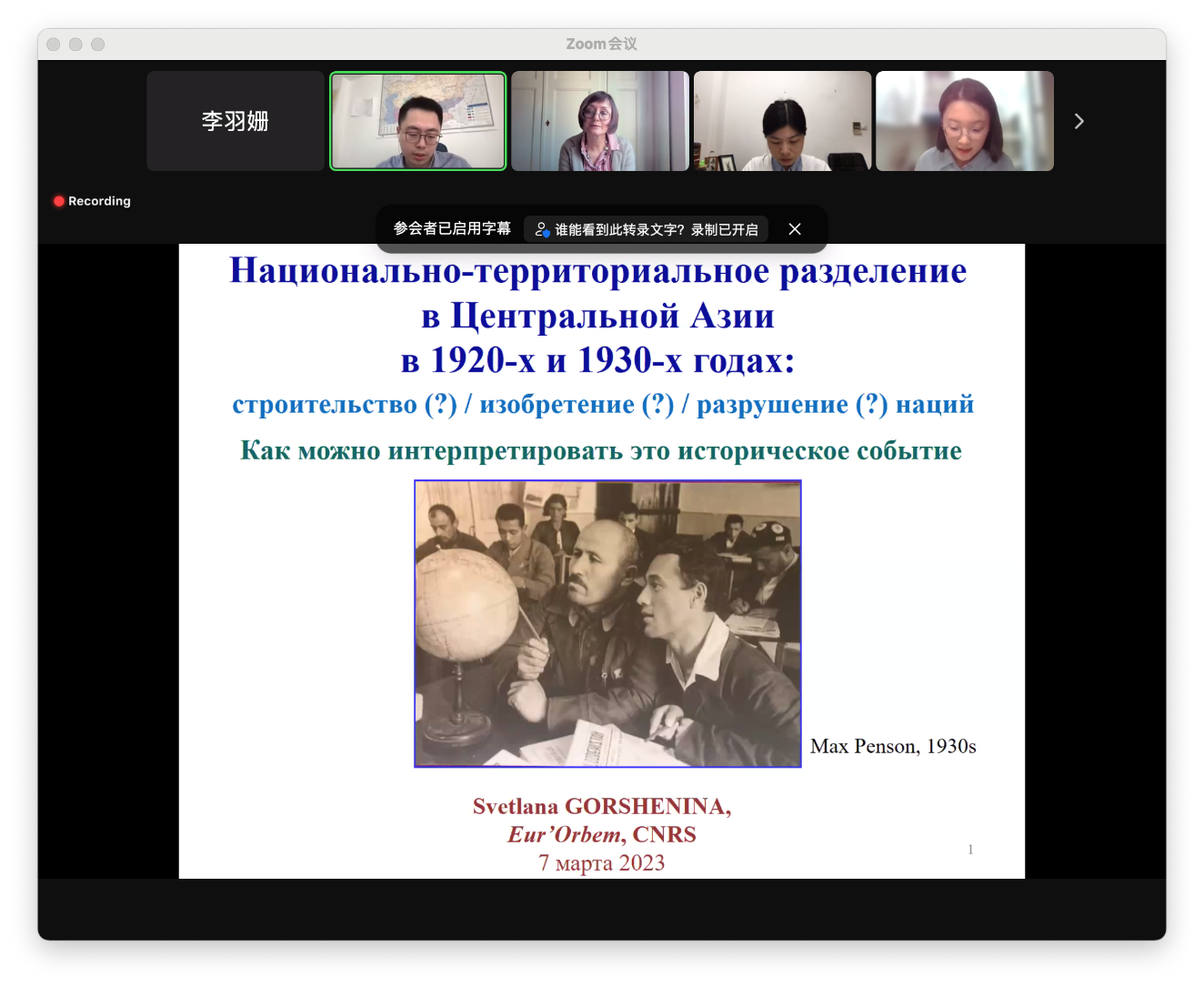 戈尔舍尼娜教授首先明确了本次讲座所讨论的“中亚”的地理范畴,即包括今中亚五国的后苏联空间。随后,她概述了对中亚划界问题的研究现状,梳理了不同时期对中亚划界过程的不同看法和评价。