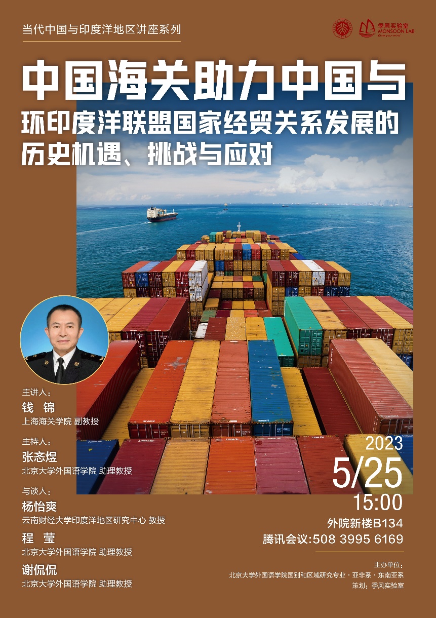 2023年5月25日,上海海关学院副教授钱锦应邀为我院师生进行题为“中国海关助力中国与环印度洋联盟国家经贸关系发展的历史机遇、挑战与应对”的讲座。本次讲座是“当代中国与印度洋地区”系列讲座的第二讲,由B体育平台国别和区域研究专业、亚非系和东南亚系主办,B体育平台张忞煜助理教授主持,云南财经大学印度洋地区研究中心杨怡爽教授、北大外院程莹助理教授和谢侃侃助理教授参与讨论。本次讲座在外院新楼B134会议室和线上平台同步举行,来自各高校的近百名师生在线参与讲座。