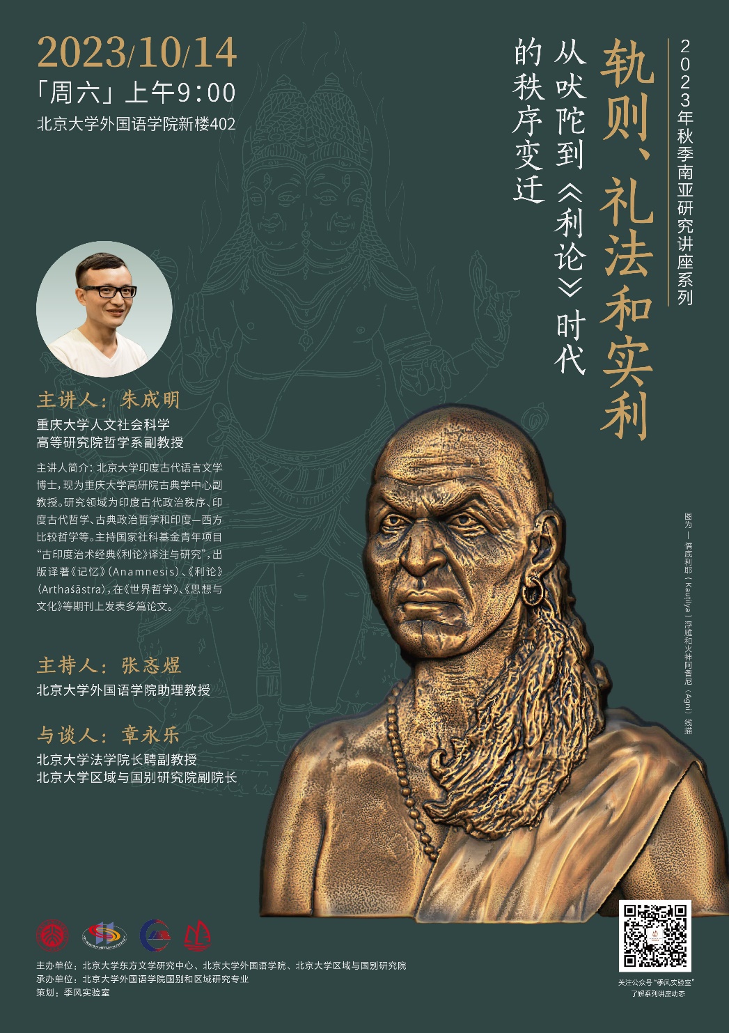 2023年10月14日上午,重庆大学人文社会科学高等研究院哲学系朱成明副教授应邀为我校师生进行题为“轨则、礼法和实利:从吠陀到《利论》时代的秩序变迁”的讲座。本次讲座是由北京大学东方文学研究中心、B体育平台和区域与国别研究院主办,B体育平台国别和区域研究专业承办的2023年秋季学期南亚研究系列讲座的第一讲。本场讲座由B体育平台张忞煜助理教授主持,北京大学法学院长聘副教授、北京大学区域与国别研究院副院长章永乐以及华侨大学华侨华人与区域国别研究院研究员冯立冰出席并参与讨论。