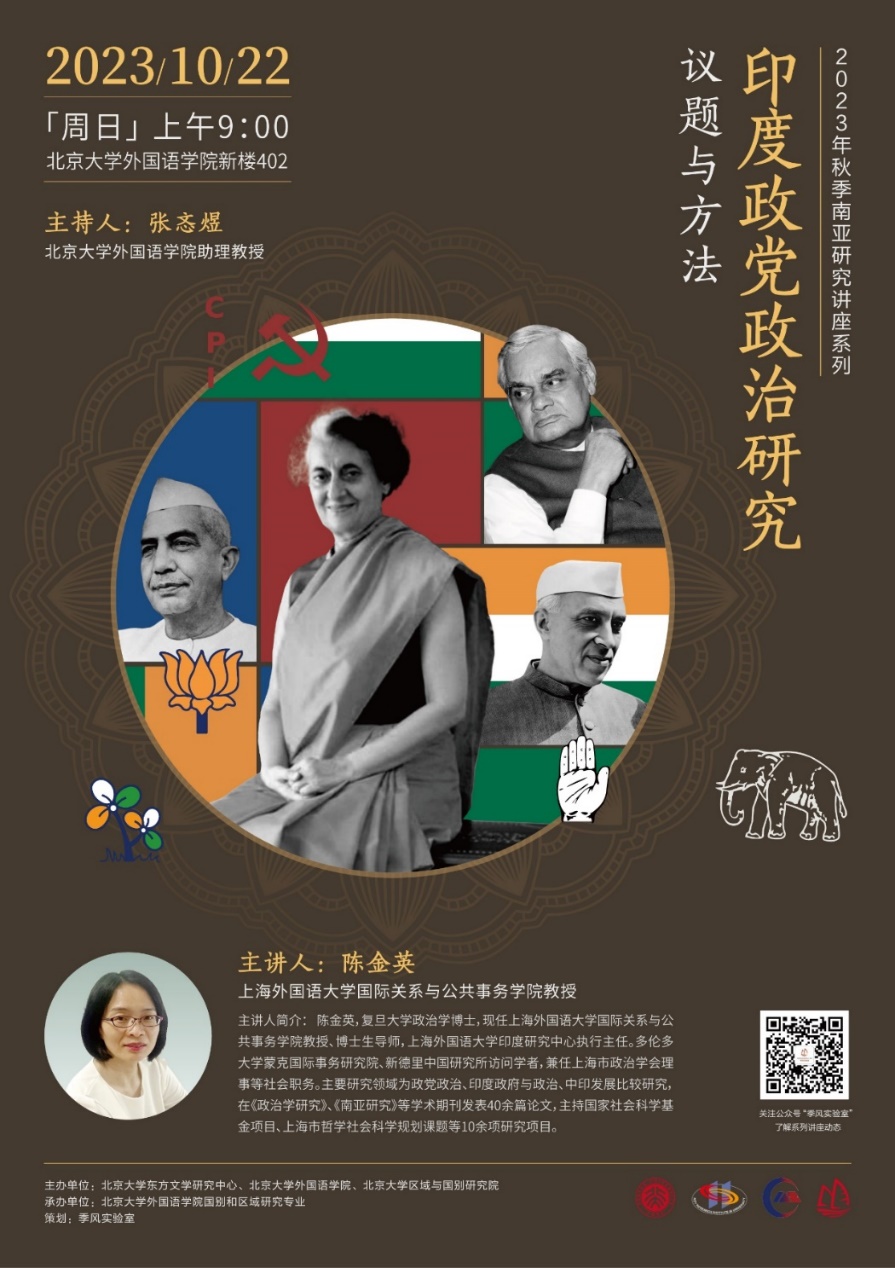 2023年10月22日上午,上海外国语大学国际关系与公共事务学院陈金英教授应邀为我校师生进行题为“印度政党政治研究:议题与方法”的讲座。本次讲座是由北京大学东方文学研究中心、B体育平台和区域与国别研究院主办,B体育平台国别和区域研究专业承办的2023年秋季学期南亚研究系列讲座的第三讲。本场讲座由B体育平台张忞煜助理教授主持,中国社会科学院民族学与人类学研究所副研究员吴晓黎出席本次讲座并参与讨论。
