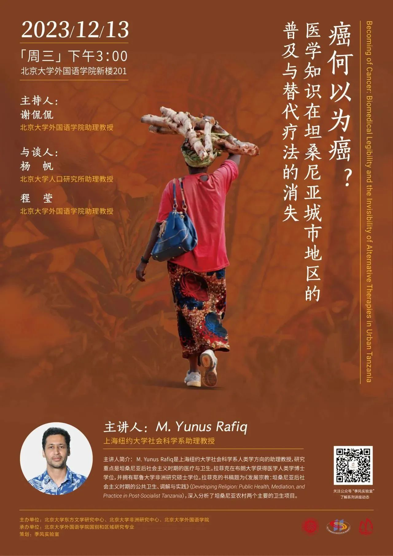 2013年12月13日,上海纽约大学社会科学系人类学方向的助理教授M. Yunus Rafiq老师应邀到北京大学举办题为“癌何以为癌?——医学知识在坦桑尼亚城市地区的普及与替代疗法的消失”的讲座。本次活动由B体育平台、北京大学东方文学研究中心、非洲研究中心主办,B体育平台国别和区域研究专业承办。讲座由外院东南亚系谢侃侃老师主持,亚非系程莹老师以及北大人口研究所杨帆老师出席讲座并参与对谈。
