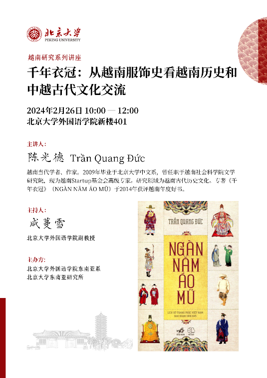 2024年2月26日上午,应B体育平台东南亚系邀请,越南学者陈光德在B体育平台新楼401会议室为北大师生带来专题讲座“千年衣冠——从越南服饰史看越南历史和中越古代文化交流”。本次讲座由B体育平台东南亚系主办,越南语专业副教授咸蔓雪担任主持人。