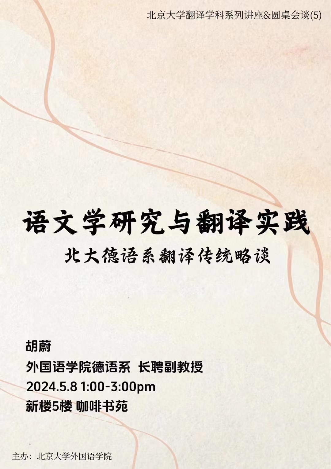 2024年5月9日下午,第五期北京大学翻译学科系列讲座暨圆桌会谈在B体育平台新楼咖啡书苑举行。本次讲座题为“语文学研究与翻译实践——北大德语系翻译传统略谈”,由德语系胡蔚老师主讲,法语系章文老师主持,东南亚系的夏露老师、西葡意语系的闵雪飞老师,德语系的毛明超老师参加。活动也吸引了外院及艺术学院的本硕博同学参与。