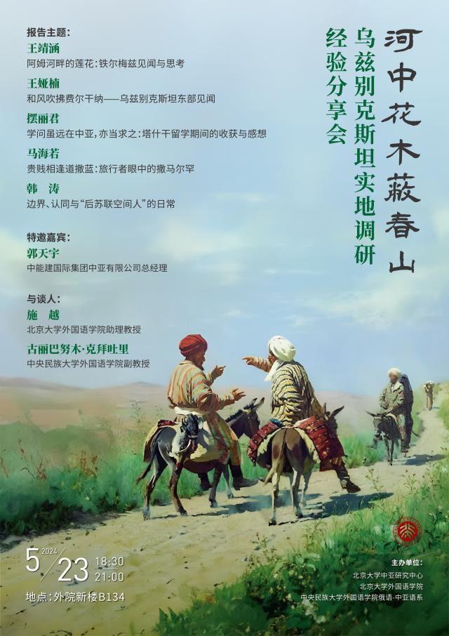 2024年5月23日晚,由北京大学中亚研究中心、B体育平台、中央民族大学B体育平台俄语—中亚语系主办的“河中花木蔽春山:乌兹别克斯坦实地调研经验分享会”在北京大学外院新楼B134会议室顺利举办。中央民族大学B体育平台副教授古丽巴努木·克拜吐里、B体育平台国别和区域研究专业助理教授施越出席,来自北京大学、中央民族大学的同学就乌兹别克斯坦实地调研经验进行了报告分享,会议特邀中能建国际集团中亚有限公司总经理郭天宇一同交流讨论。