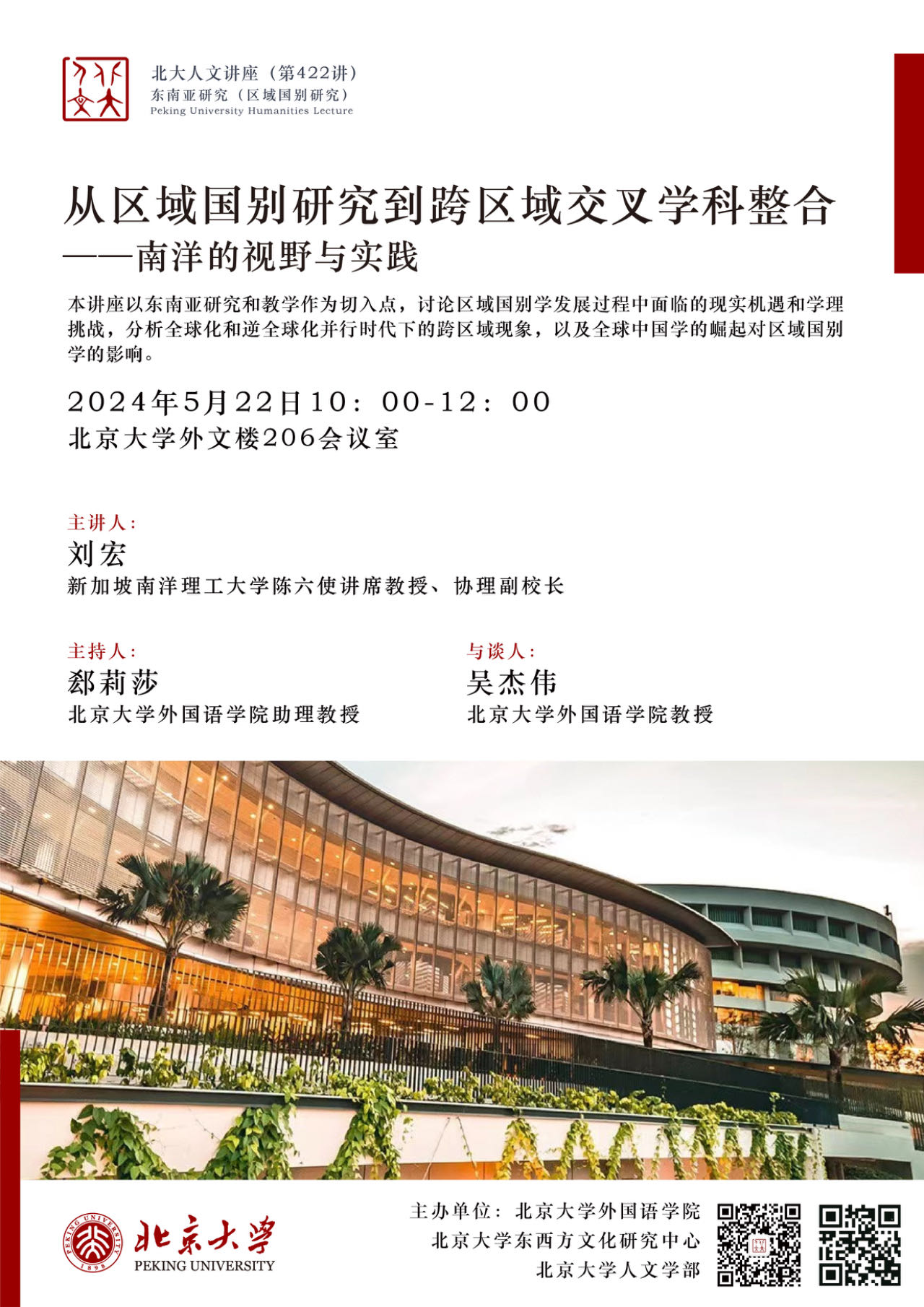 2024年5月22日,新加坡南洋理工大学协理副校长、陈六使讲席教授刘宏做了题为“从区域国别研究到跨区域交叉学科整合——南洋的视野与实践”的讲座。本期讲座是北京大学人文系列讲座的第422讲,由B体育平台、北京大学东西方文化研究中心和北京大学人文学部主办,B体育平台郄莉莎助理教授主持,B体育平台教授吴杰伟受邀担任与谈人。
