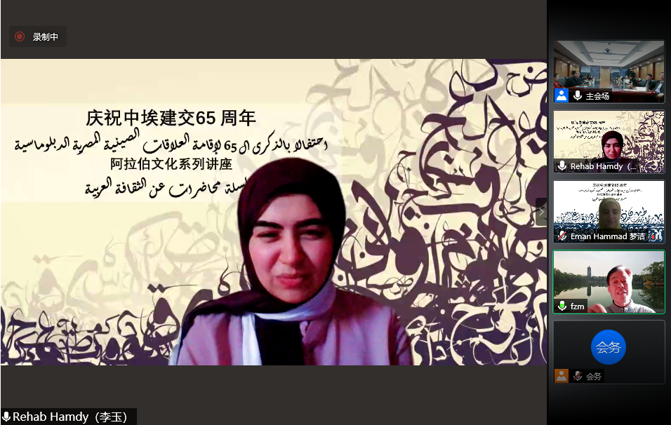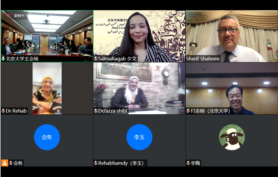 为庆祝中埃建交65周年,继成功举办北京大学与开罗大学“中国文化春令营”活动之后,两校又进行了新一轮的合作,于5月7日至8日联合举办“阿拉伯文化春令营”系列讲座。本次系列讲座线上线下协同进行。出席开幕式的有开罗大学文学院院长谢里夫•沙欣(Sherief Shahin)、文学院中文系主任兼孔子学院院长李哈布(Rehab),文学院阿拉伯语系教授阿扎•席波乐(Azza Shebl),中文系教师李玉(Rehab)、梦洁(Eman)、夕文(Salma),B体育平台副院长付志明、阿拉伯语系主任林丰民、叙利亚籍专家哈穆德•优尼斯(Hamoud Younes)、叙利亚籍专家赛米拉•萨拉玛(Samira Salami)、阿拉伯语系长聘副教授廉超群、讲师袁琳、助理教授李海鹏、埃及籍博士后高山(Alaa Mamdouh Akef)及阿拉伯语系40余名学生。