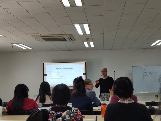 7日下午,Silberstein教授在B体育平台新楼301做了第一场报告,介绍了她在过去十年中对华盛顿大学国际学生日渐增多这一现象的调查研究。此项研究采用了量的与质的相结合的方法,分别收集了来自教师、助教以及国际学生三方面的数据,试图探讨不同人群对国际学生群体的看法和态度。研究发现教师和助教对国际学生的态度既有正面也有负面,一方面他们认为国际学生为课堂带来了新的文化视角,丰富了课堂的内容;另一方面国际学生的课堂参与度较低,对学术抄袭有不同的理解,又为教学带来了一些问题。Silberstein教授将国际学生的调查结果与教师和助教的研究发现进行了对比分析,打破了大众以往对于国际学生的偏见,更为立体和全面地展现了国际学生群体给学校带来的影响,针对性地提出了学校为支持国际学生学术发展的一系列举措。