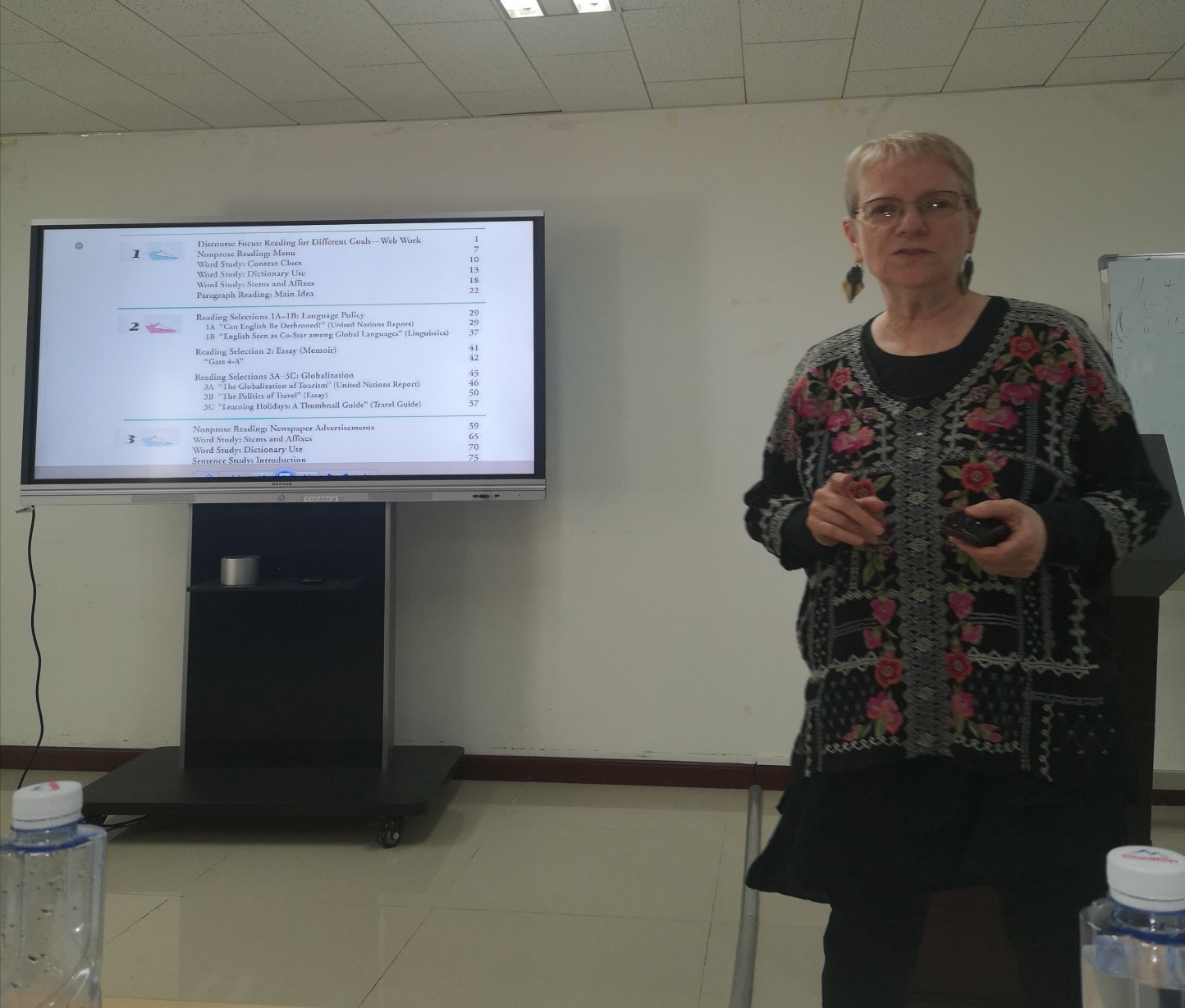 8日下午,Silberstein教授在B体育平台新楼301给大学英语教研室的教师及语言所的师生进行了二语阅读教学的展示性讲座。整场报告围绕着以下几个问题展开:什么是阅读?阅读课的目标是什么?阅读课中教师承担着怎样的角色?如何进行批判性阅读的教学?如何对阅读材料进行评估?Silberstein教授在报告中不仅有理论性的介绍,也有直观简明的教学示范。她以一首不同寻常的小诗作为讲座的开场,让在场师生一起进行阅读和讨论。面对师生们对于同一问题给出的不同答案,Silberstein教授解释到人们在阅读时都会带着自己独特的社会经历和文化背景进行阅读,作为阅读教师需要认识到这一点并充分挖掘出学生的潜力,让他们做到读有所思,读有所得。接下来,Silberstein教授还展示了阅读中词汇学习的方法、如何针对不同材料调整阅读策略、如何用简单的问题启发学生进行批判性阅读等。