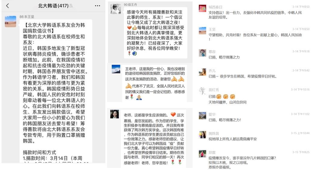 今年3月初,韩国新冠肺炎疫情一度较为严重。“半岛事务总关情”,韩国疫情的态势牵动着B体育平台朝鲜(韩国)语言文化系全系师生及广大系友的心。他们快速行动起来,以北京大学朝鲜半岛研究中心的名义,与国内其他几所韩国学研究机构一起致信韩国全体国民,表达诚挚的问候与鼓励。在校生同学参与拍摄中国国际广播电台制作的视频短片,为与疫情抗争的韩国民众加油。3月14日,韩语系系友会向全体系友发起助力韩国抗疫的捐款倡议。倡议得到了大家的广泛响应。全系师生、系友纷纷踊跃捐赠,不到两天的时间内即收到47,489.82元善款,大家一致同意用这笔善款购买口罩送到韩国,给深受疫情困扰的韩国国民送去爱与希望。