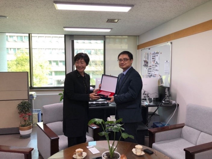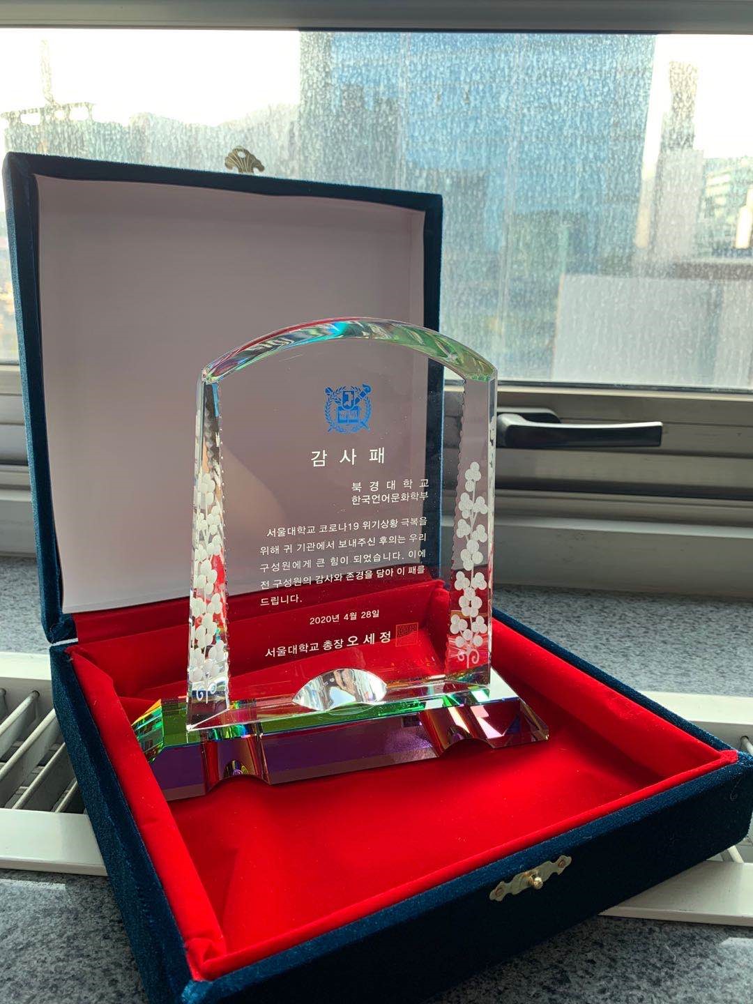 由于物流不畅、通关手续复杂,口罩迟迟难以抵达,双方的师生焦急万分,多次通过电话、邮件等方式就物资进度进行了沟通。在中韩双方的共同努力下,4月28日,在仁川海关停留35天的2.4万只口罩终于抵达韩国国立首尔大学。当天下午,我驻韩大使馆公使衔参赞方坤、公报官覃晓逵、韩国首尔科学综合大学院大学教授黄菲、首尔大学博士研究生张磊等几位在韩系友前往首尔大学参加了捐赠仪式。捐赠仪式上,首尔大学学生处处长郑效志教授受首尔大学吴世正校长委托向韩语系全体师生及系友赠送感谢牌,她表示:“感谢韩语系将这批宝贵的抗疫物资捐赠给首尔大学,为我们抗击疫情工作带来了莫大的支持。北京大学与首尔大学自1993年开展学术交流,2001年签署学生交换协议,一直以来双方开展了活跃的交流活动。我相信此次守望相助的捐赠活动可以成为两校发展的新契机,我也相信在中韩两国的共同努力下,双方一定能战胜疫情。”