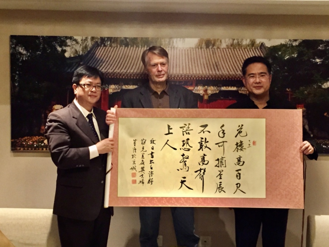 2015年10月,时任副校长李岩松代表北大将董强书写的李白诗赠送给来访的勒克莱齐奥