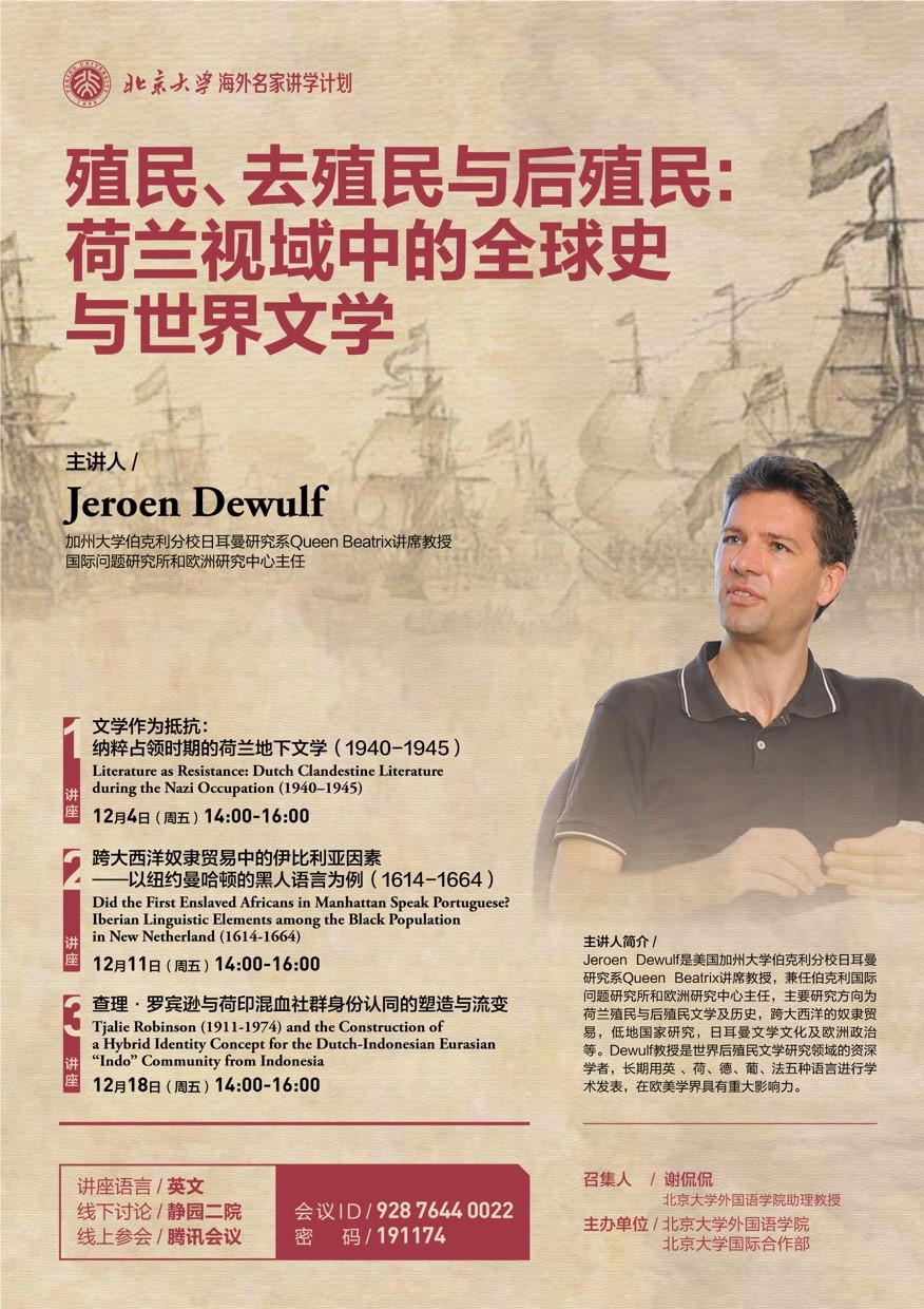2020年12月,B体育平台在国际合作部“海外名家讲学计划”的支持下主办了三场题为“殖民、去殖民与后殖民:荷兰视域中的全球史与世界文学”的系列讲座。主讲人杰罗恩•德伍夫(Jeroen Dewulf)是加利福尼亚大学伯克利分校日耳曼研究系贝娅特丽克丝女王讲席教授(Queen Beatrix Chair Professor),兼任伯克利国际问题研究所和欧洲研究中心主任,主要研究方向为荷兰殖民与后殖民文学及历史,跨大西洋的奴隶贸易,低地国家文化,日耳曼文学及欧洲政治等。德伍夫教授是世界殖民与后殖民研究领域的资深学者,长期用英 、荷、德、葡、法五种语言进行学术发表,在欧美学界具有重大影响力。受疫情影响,德伍夫教授未能到达燕园现场,因此系列讲座以线上线下相结合的方式进行,演讲同时在腾讯会议、哔哩哔哩等网上平台上直播,吸引了北京大学校内外的众多学者和同学观看、学习和讨论。