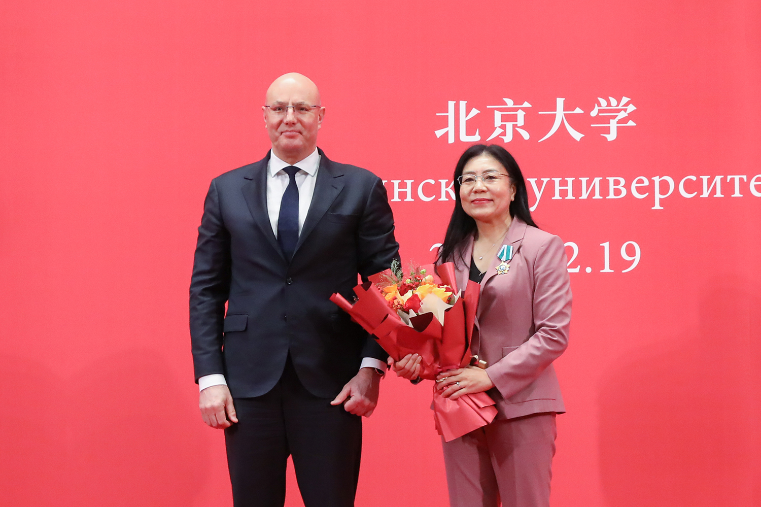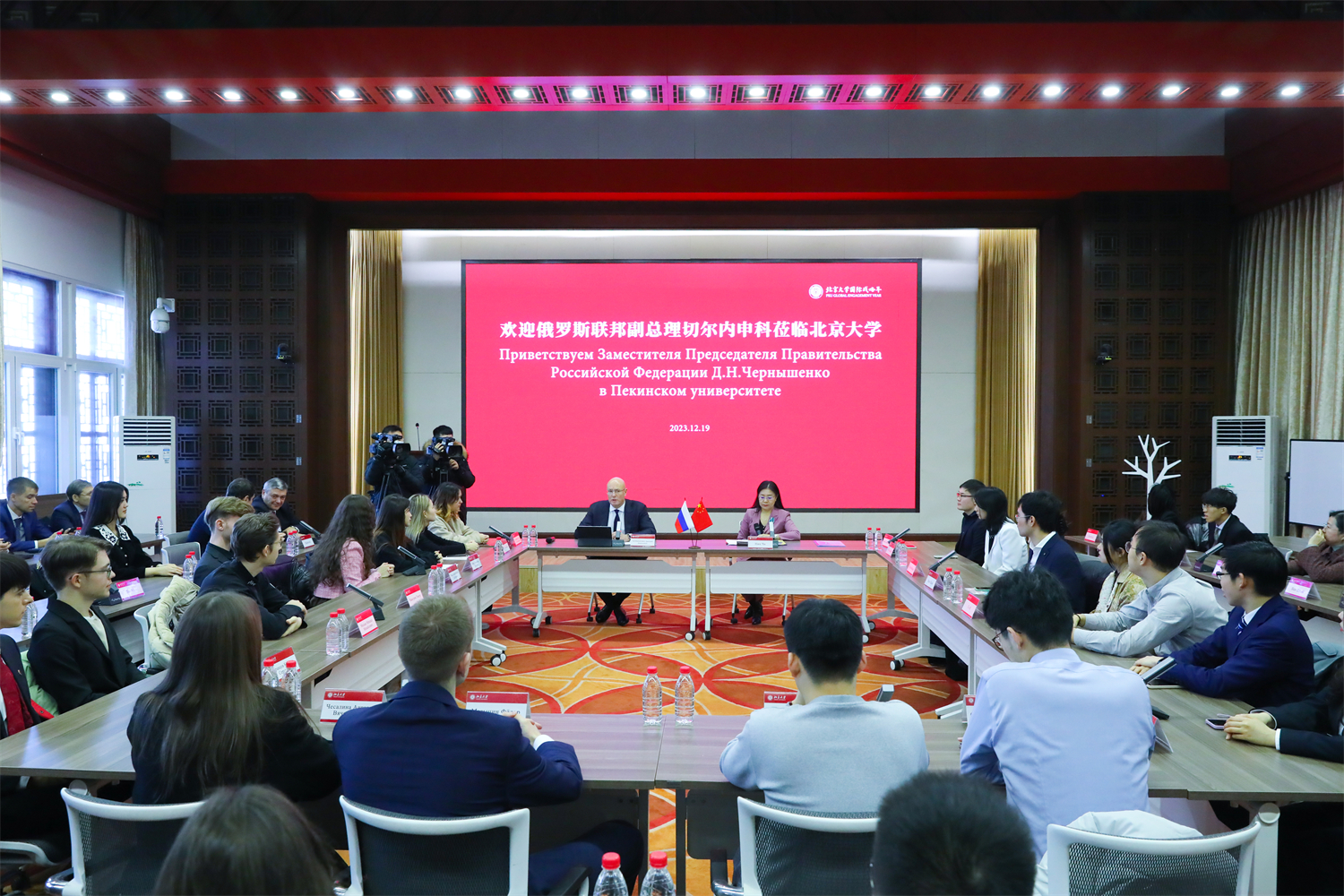12月19日上午,俄罗斯联邦副总理切尔内申科到访北京大学,北大校长龚旗煌院士会见来宾。切尔内申科与师生代表座谈,并为北大党委副书记、副校长宁琦教授颁授俄罗斯联邦“友谊勋章”。俄罗斯联邦外交部副部长鲁坚科、科教部副部长谢基林斯基陪同访问。党委常委、副校长张锦出席相关活动。