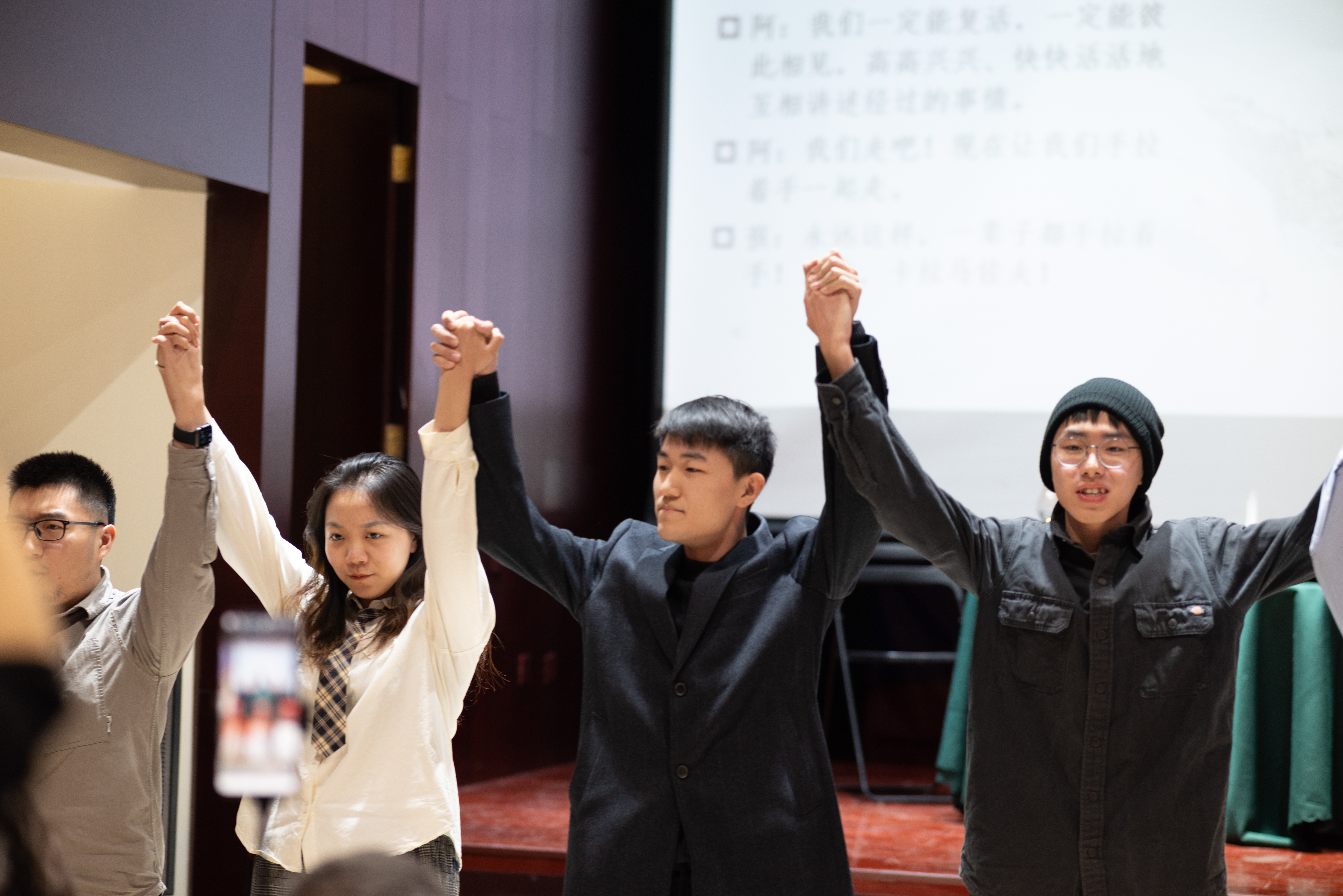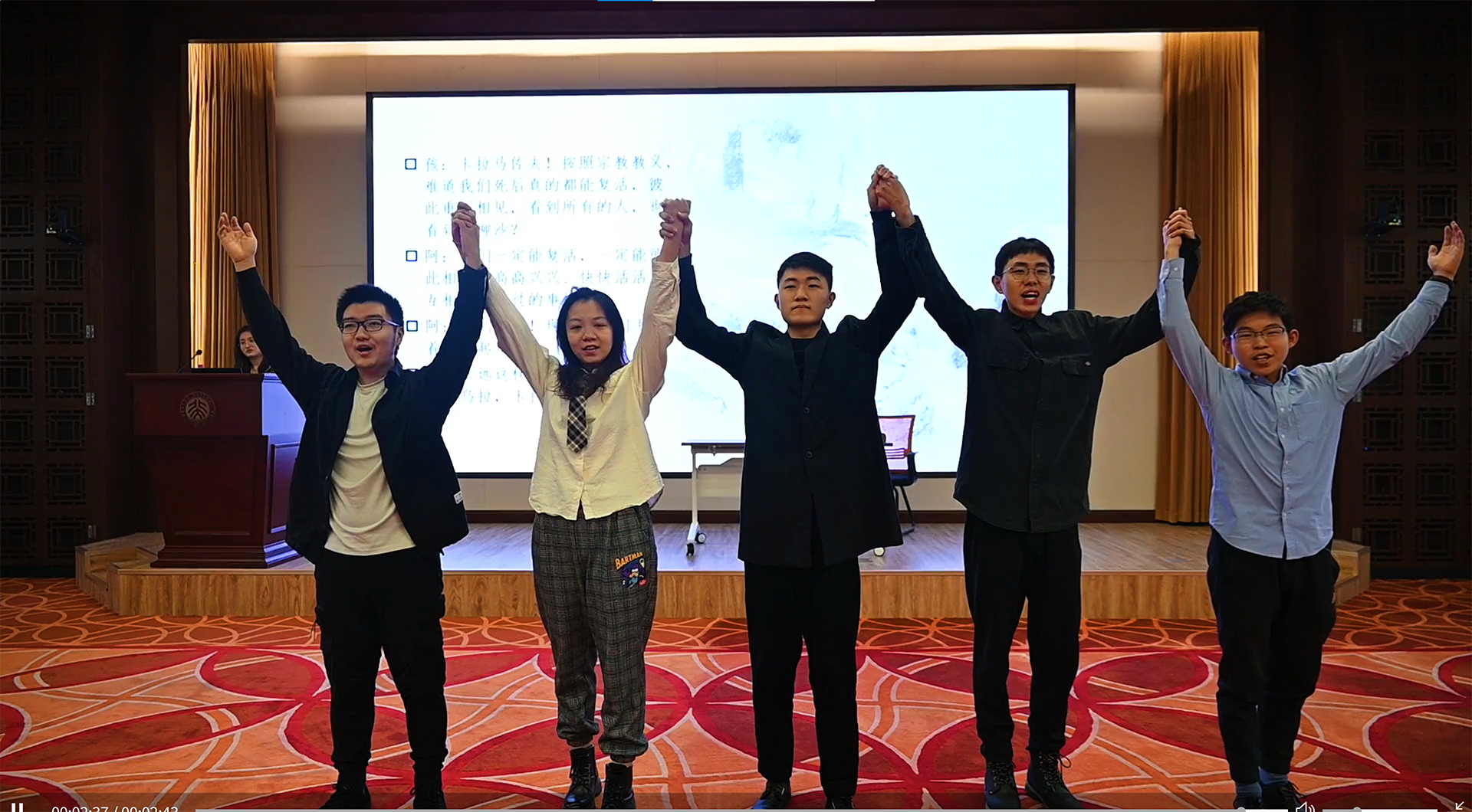 由B体育平台俄罗斯语言文学系同学排演的三幕话剧«Раскольник и др.»(《拉斯柯尔尼科夫一众》)是本次活动的第五个节目。整部剧时长约十六分钟,《地下室手记》《罪与罚》《群魔》《荒唐人的梦》《卡拉马佐夫兄弟》中的主人公们轮番登场,他们在惶恐焦虑、急切不安的状态下爆发,以难以遏制的激情直抒胸臆。通过他们的表演,观众可以理解陀氏人物的内心世界,体会他们在思想上的传承、在观念上的碰撞。每幕仅五六分钟的话剧,布景道具要而不繁,汇聚传统手法和现代风尚,有力呈现了陀氏作品的精神内涵。