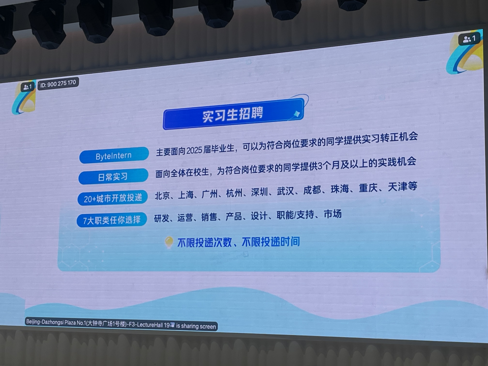 紧接着,王磊告诉师生,字节跳动致力于打造一个充满活力与人文关怀的工作环境。“跳跳糖”公益组织、年度音乐节、全球摄影展及丰富多彩的社团活动,让员工在工作之余也能享受生活。弹性工作时间安排,以及每两周一次的周三活动日,让员工自由规划工作与休息,享受工作的乐趣。
