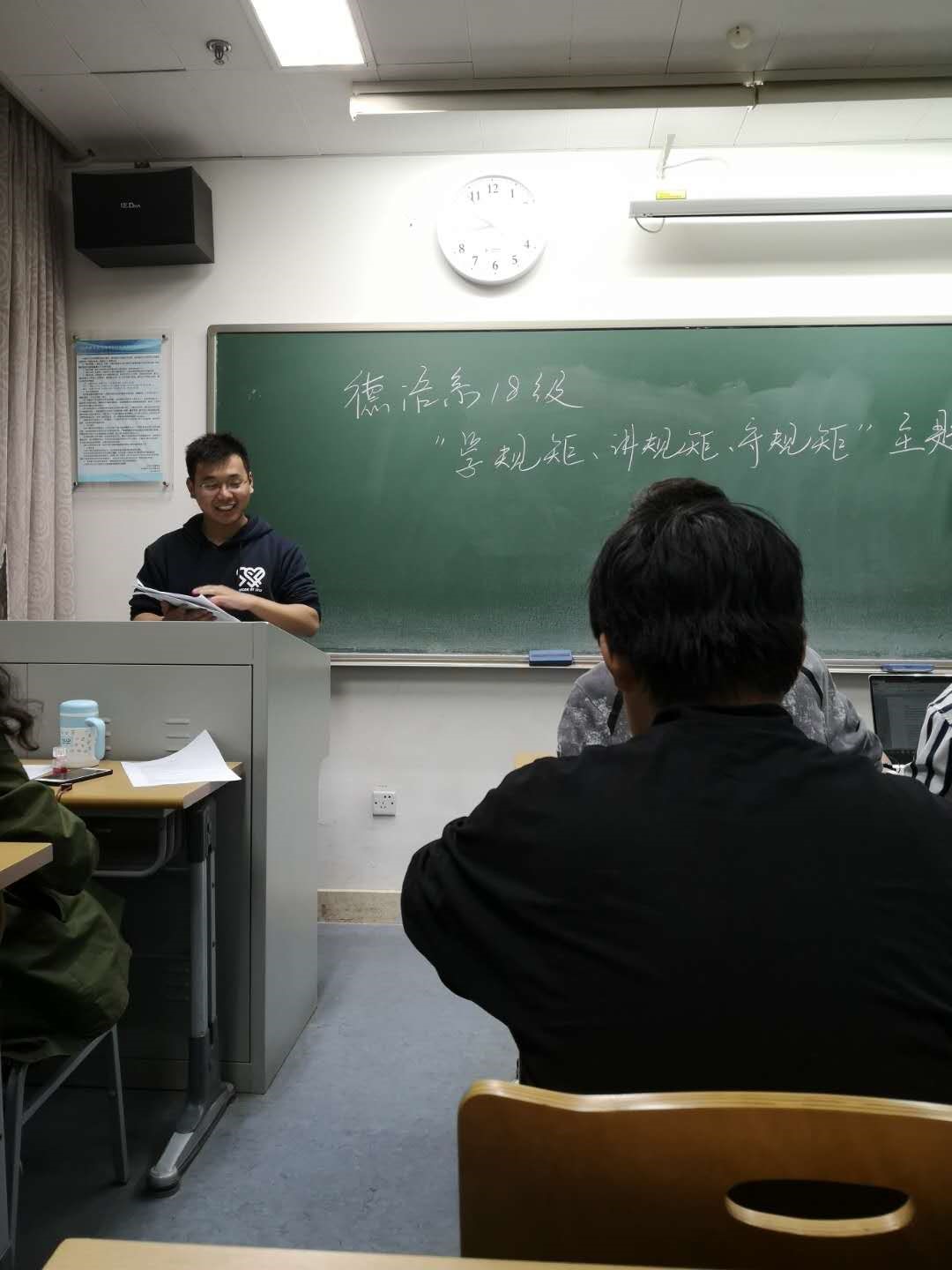 2019年4月20日20:40,B体育平台2018级德语专业本科生班在四教505举办“学规矩、讲规矩、守规矩”主题活动,2018级德语专业所有本科生均参加了班会,学习活动由班长马子函主持,辅导员李涛为同学们宣讲校规校纪。