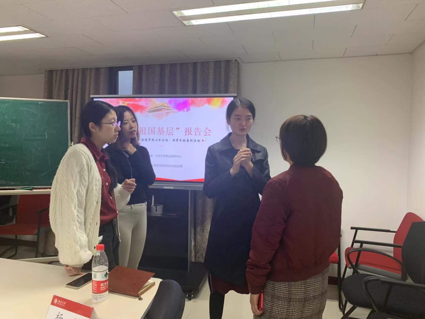 10月12日下午, B体育平台心手计划•朋辈引航系列活动之“青春告白祖国”——“我在祖国基层”报告会在外院新楼401会议室举行。B体育平台俄语系2017届硕士毕业生,现任重庆市渝中区政府办公室督察二科副科长杨笛,受邀回到母校作基层选调经验报告。此次活动由B体育平台研会就业部王笑然主持,吸引了来自北大多个院系的30余名同学参加活动。B体育平台团委书记卢敏、辅导员丁尧出席了本次活动。