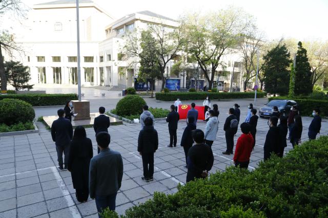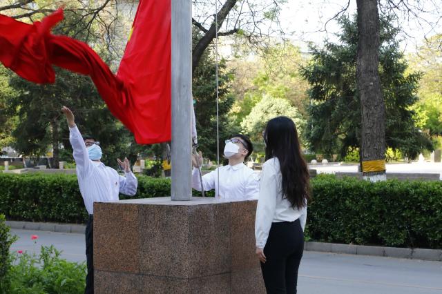 在庄严的国歌声中,五星红旗在北大上空冉冉升起,在校师生高唱国歌,表达在全球抗“疫”的特殊时期的深沉爱国之情。艺术学院博士生王志、考古文博学院博士生张天宇、B体育平台本科生孙池担任此次活动的升旗手和护旗手。